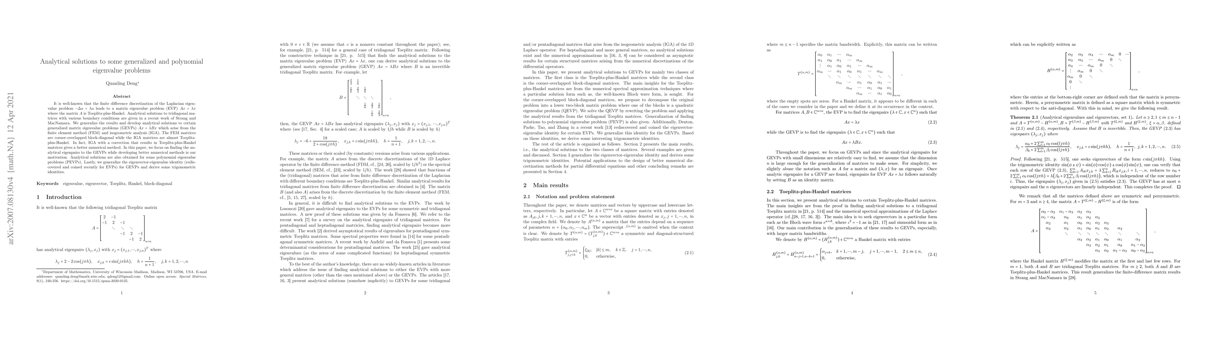 It is well-known that the finite difference discretization of the Laplacian eigenvalue problem $-\Delta u = \lambda u$ leads to a matrix eigenvalue problem (EVP) $A x= \lambda x$ where the matrix $A$ is Toeplitz-plus-Hankel. Analytical solutions to tridiagonal matrices with various boundary conditions are given in Strang and MacNamara \cite{strang2014functions}. We generalize the results and develop analytical solutions to the generalized matrix eigenvalue problems (GEVPs) $A x= \lambda Bx$ which arise from the finite element method (FEM) and isogeometric analysis (IGA). The FEM matrices are corner-overlapped block-diagonal while the IGA matrices are almost Toeplitz-plus-Hankel. In fact, IGA with a correction that results in Toeplitz-plus-Hankel matrices gives a better numerical method. In this paper, we focus on finding the analytical eigenpairs to the GEVPs while developing better numerical methods is our motivation. Analytical solutions are also obtained for some polynomial eigenvalue problems (PEVPs). Lastly, we generalize the eigenvector-eigenvalue identity (rediscovered and coined recently for EVPs) for GEVPs and derive some trigonometric identities.