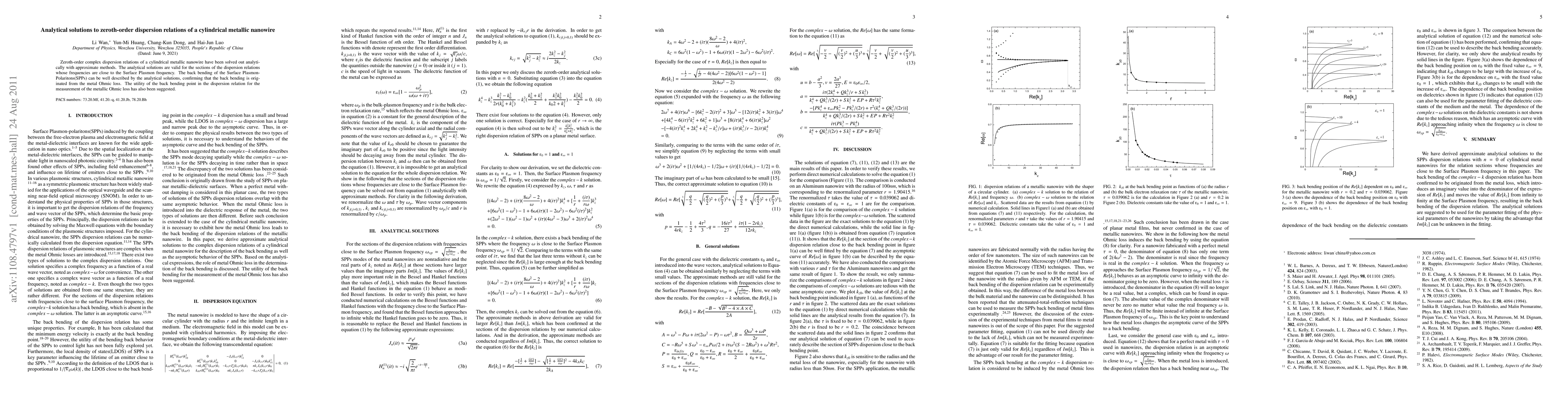 This paper presents analytical solutions to zeroth-order dispersion relations of a cylindrical metallic nanowire, valid near the Surface Plasmon frequency. The solutions describe the back bending of Surface Plasmon-Polaritons, attributing it to metal Ohmic loss, and suggest using this phenomenon for measuring metallic Ohmic loss.