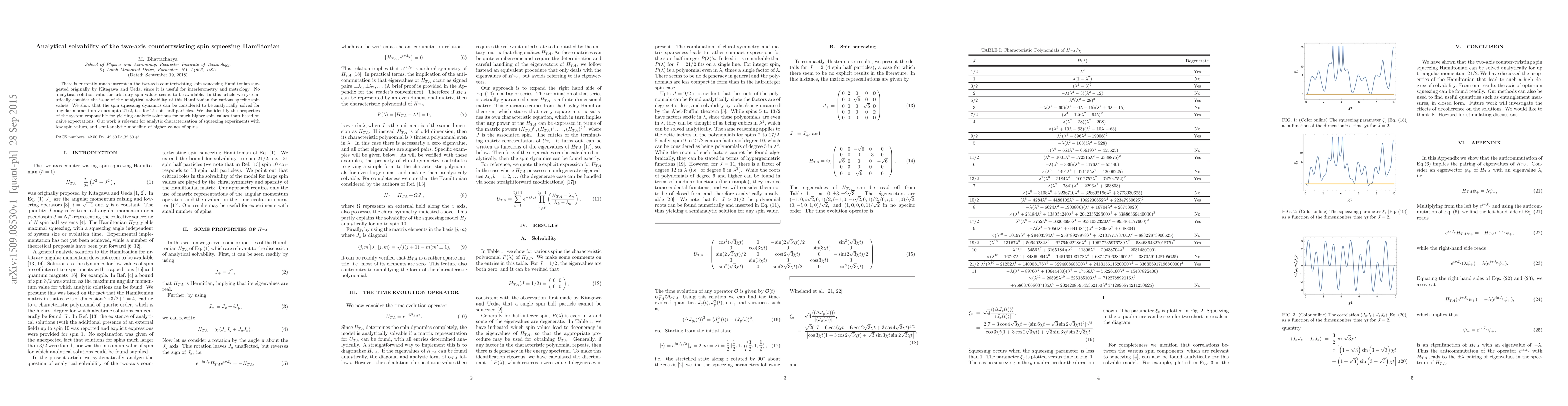 There is currently much interest in the two-axis countertwisting spin squeezing Hamiltonian suggested originally by Kitagawa and Ueda, since it is useful for interferometry and metrology. No analytical solution valid for arbitrary spin values seems to be available. In this article we systematically consider the issue of the analytical solvability of this Hamiltonian for various specific spin values. We show that the spin squeezing dynamics can be considered to be analytically solved for angular momentum values upto $21/2$, i.e. for $21$ spin half particles. We also identify the properties of the system responsible for yielding analytic solutions for much higher spin values than based on naive expectations. Our work is relevant for analytic characterization of squeezing experiments with low spin values, and semi-analytic modeling of higher values of spins.