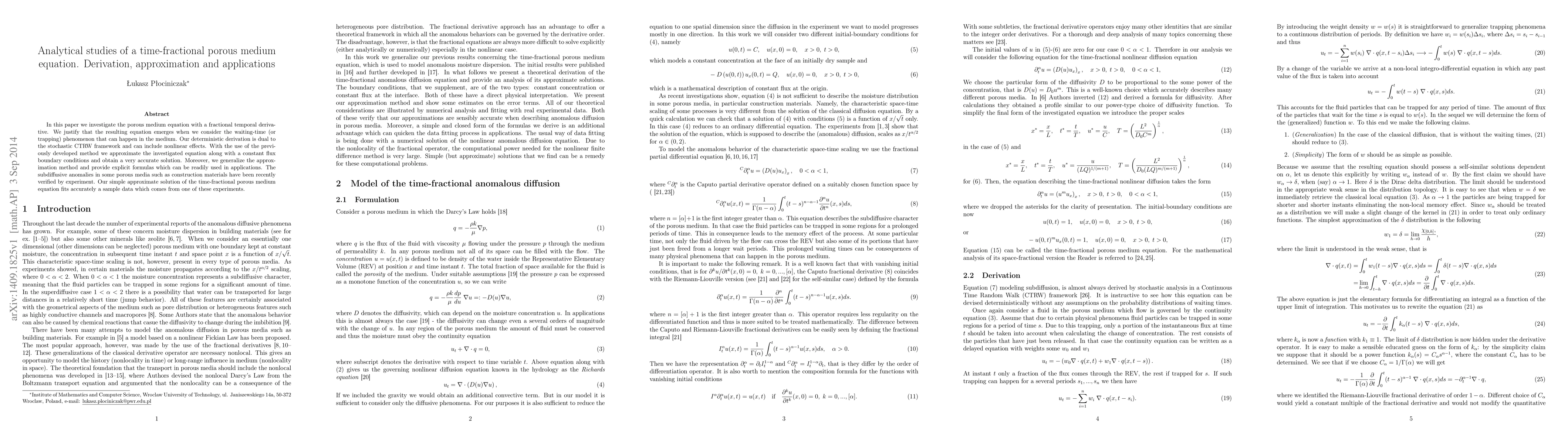 This paper explores the porous medium equation with a fractional temporal derivative, deriving it through a deterministic approach that accounts for waiting-time phenomena. The authors develop an approximation method to solve the equation under constant flux boundary conditions, providing explicit formulas for practical applications and demonstrating accurate fitting to experimental data from construction materials.