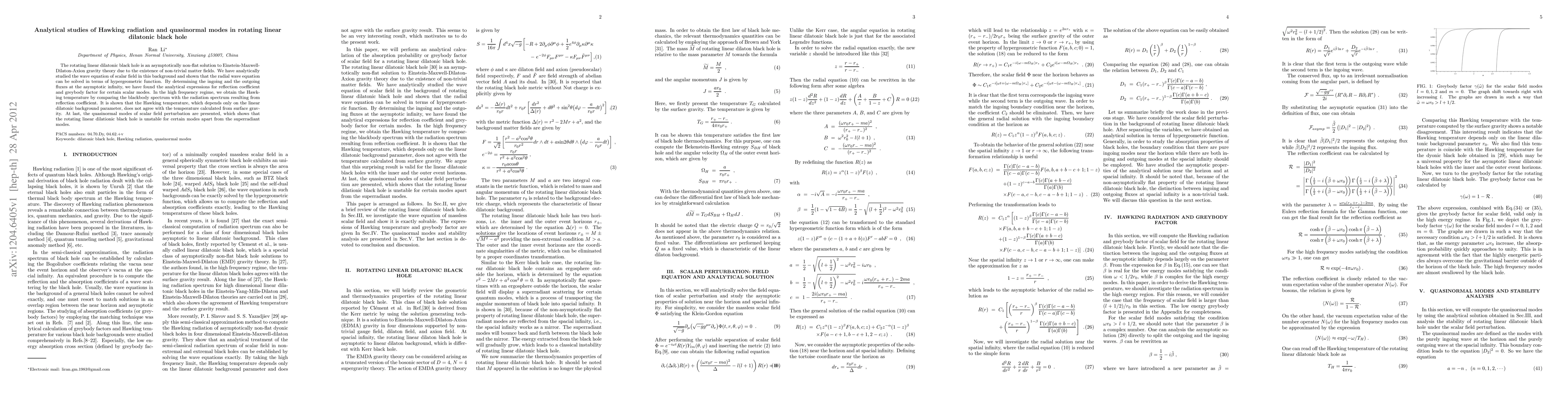 This paper analytically investigates Hawking radiation and quasinormal modes in rotating linear dilatonic black holes, deriving expressions for reflection coefficient and greybody factor. It finds that the Hawking temperature depends on the linear dilatonic parameter and differs from that calculated from surface gravity, while also revealing instability in certain scalar field perturbation modes.