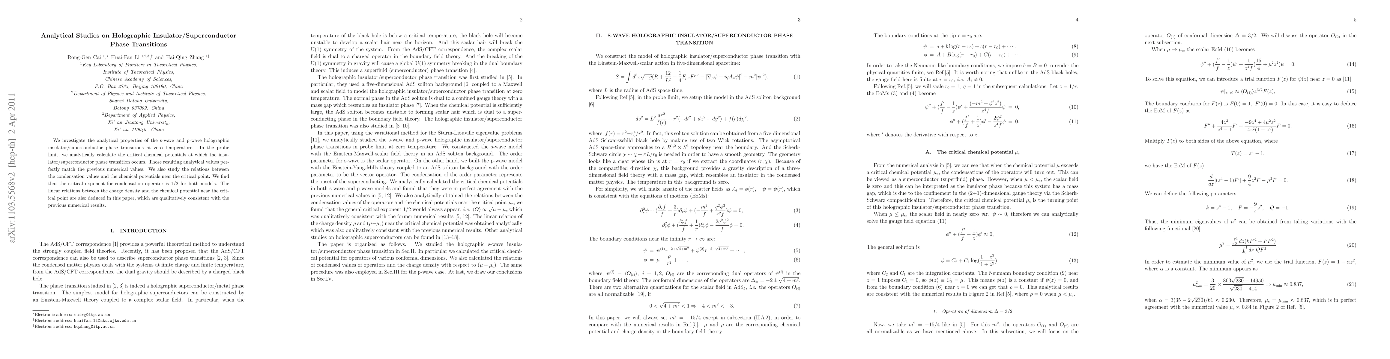This paper analytically investigates the zero-temperature insulator/superconductor phase transitions in s-wave and p-wave holographic models, calculating critical chemical potentials and finding matching values with previous numerical results. The study reveals a critical exponent of 1/2 for the condensation operator and linear relations between charge density and chemical potential near the critical point, consistent with prior numerical findings.