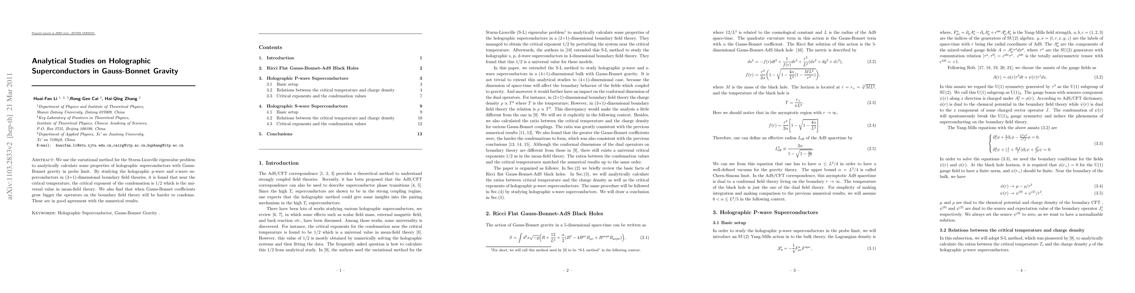 The paper analytically calculates properties of holographic superconductors in Gauss-Bonnet gravity using the variational method. Near the critical temperature, it finds a universal condensation critical exponent of 1/2 and shows that larger Gauss-Bonnet coefficients make boundary field theory operators harder to condense, matching numerical results.