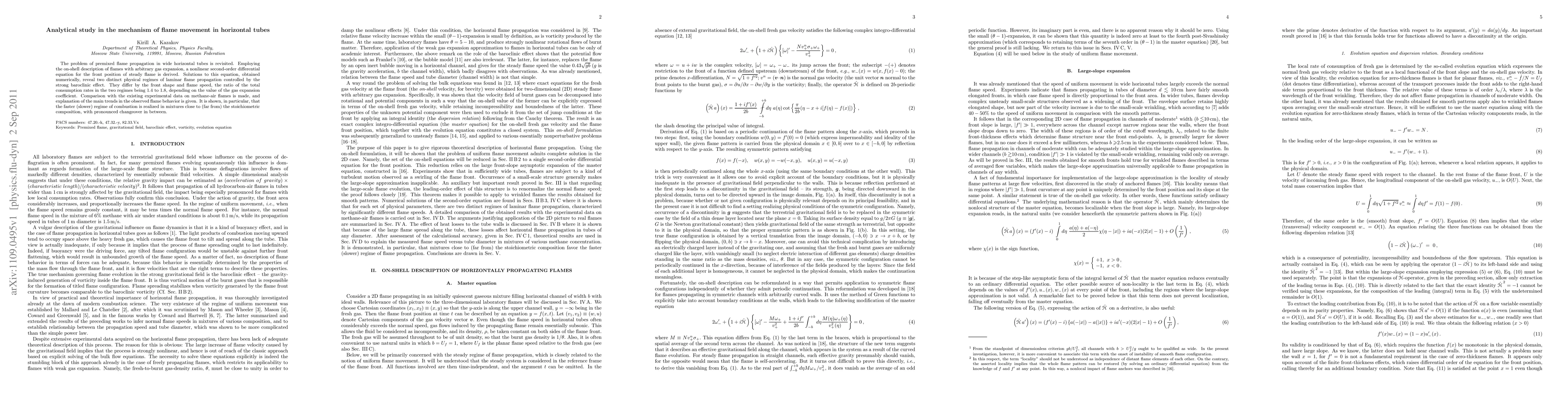 This study derives a nonlinear second-order differential equation for steady flame front position in horizontal tubes, revealing two distinct laminar propagation regimes influenced by the baroclinic effect. Comparisons with experimental methane-air flame data show regime transitions based on the mixture's proximity to stoichiometric composition.