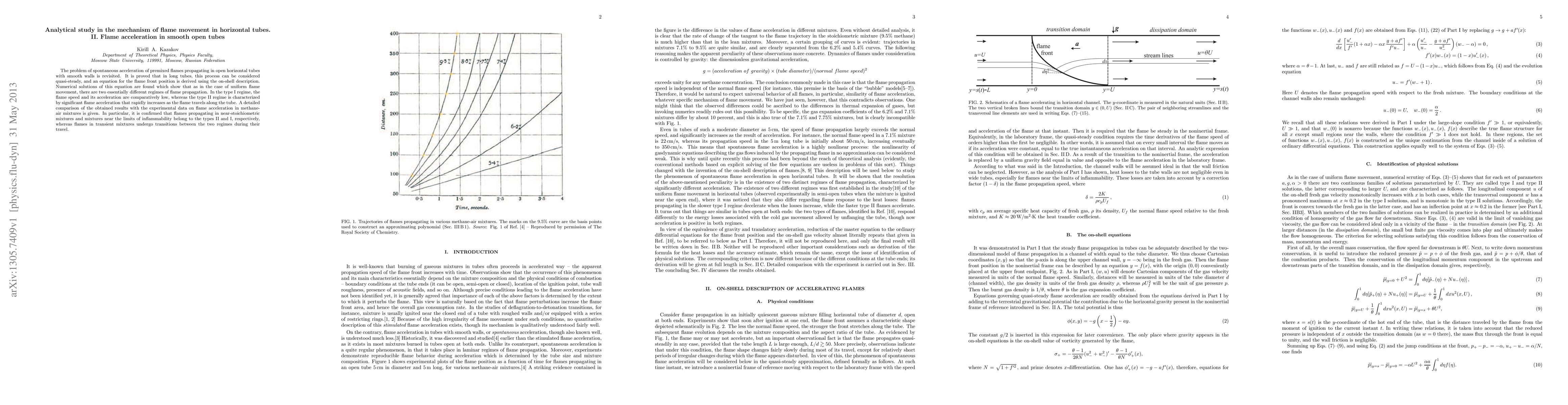 This paper explores the spontaneous acceleration of premixed flames in long, smooth horizontal tubes, deriving a quasi-steady equation for flame front position and identifying two regimes of flame propagation: a low-acceleration type I and a high-acceleration type II. Experimental data confirms the theoretical findings, showing transitions between regimes based on mixture composition.