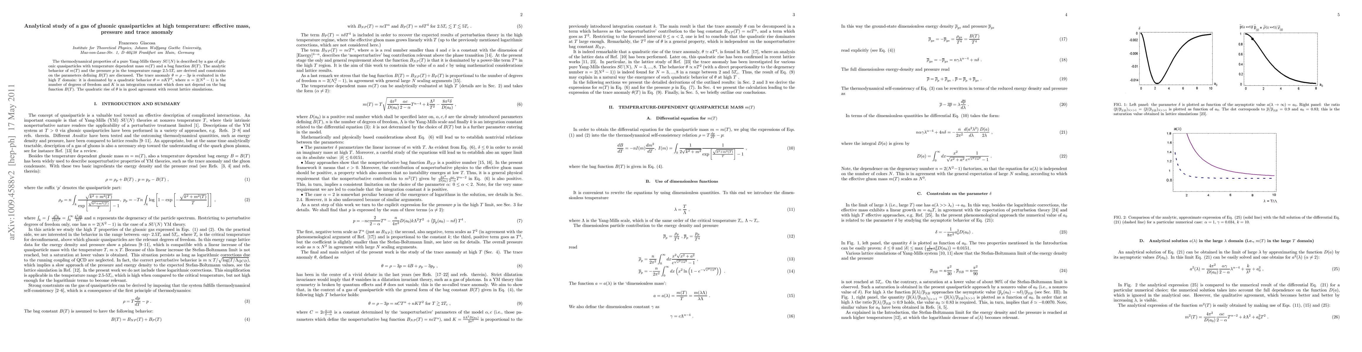 Researchers studied a gas of gluonic quasiparticles in high-temperature Yang-Mills theory, finding that the mass and pressure behave analytically at high T, with constraints on the bag function, and that the trace anomaly is dominated by a quadratic behavior.