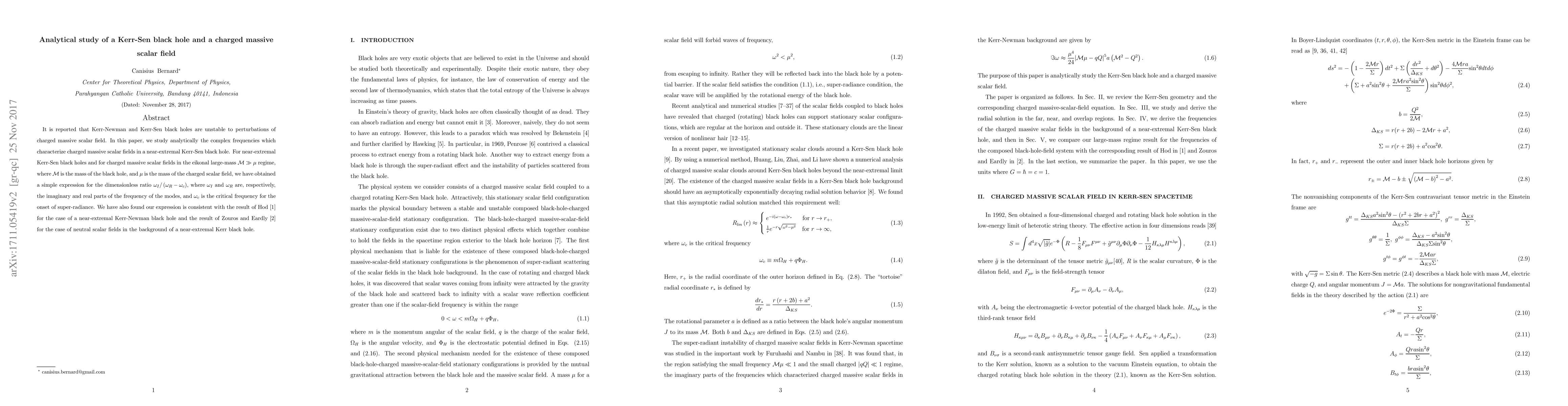 This paper analytically investigates the instability of Kerr-Sen black holes to perturbations from charged massive scalar fields, deriving a simple expression for the ratio of complex frequency components in the near-extremal regime. The derived expression aligns with prior results for Kerr-Newman and Kerr black holes, confirming its consistency.