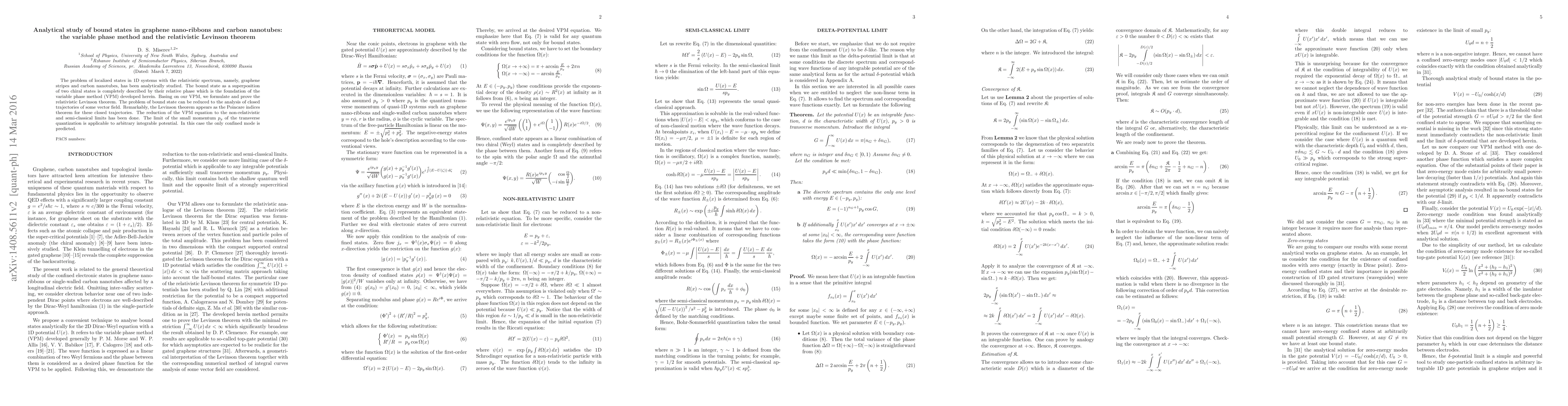 This paper analytically investigates localized states in 1D systems like graphene nano-ribbons and carbon nanotubes using the variable phase method (VPM). The VPM describes bound states through their relative phase and leads to a formulation of the relativistic Levinson theorem, which connects to the Poincare indices theorem.