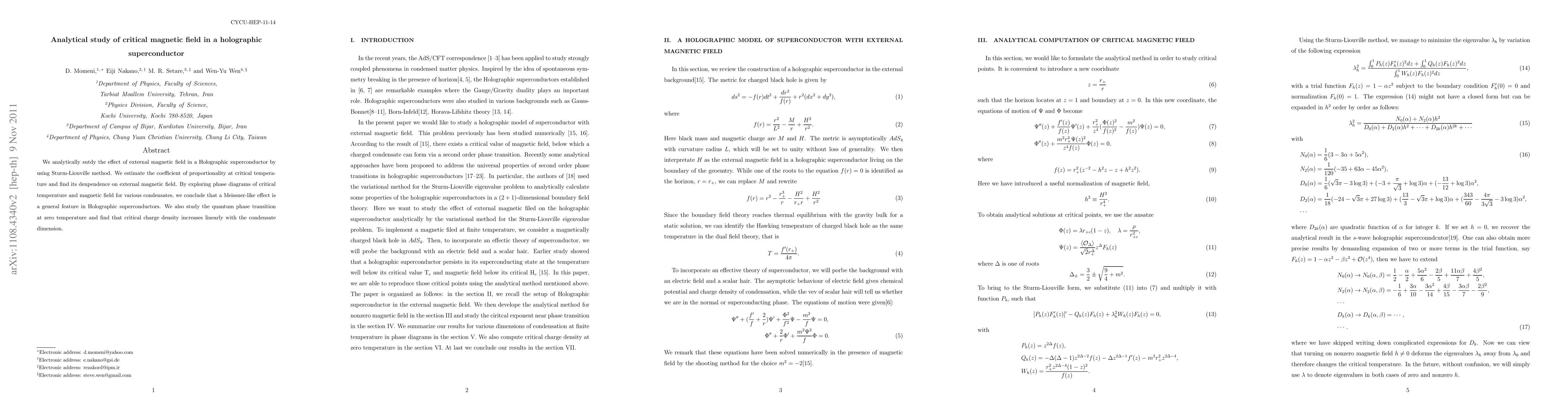This paper analytically investigates the impact of external magnetic fields on holographic superconductors using the Sturm-Liouville method, revealing a Meissner-like effect and a linear relationship between critical charge density and condensate dimension at zero temperature. The study also estimates the proportionality coefficient at critical temperature and its dependence on the magnetic field.