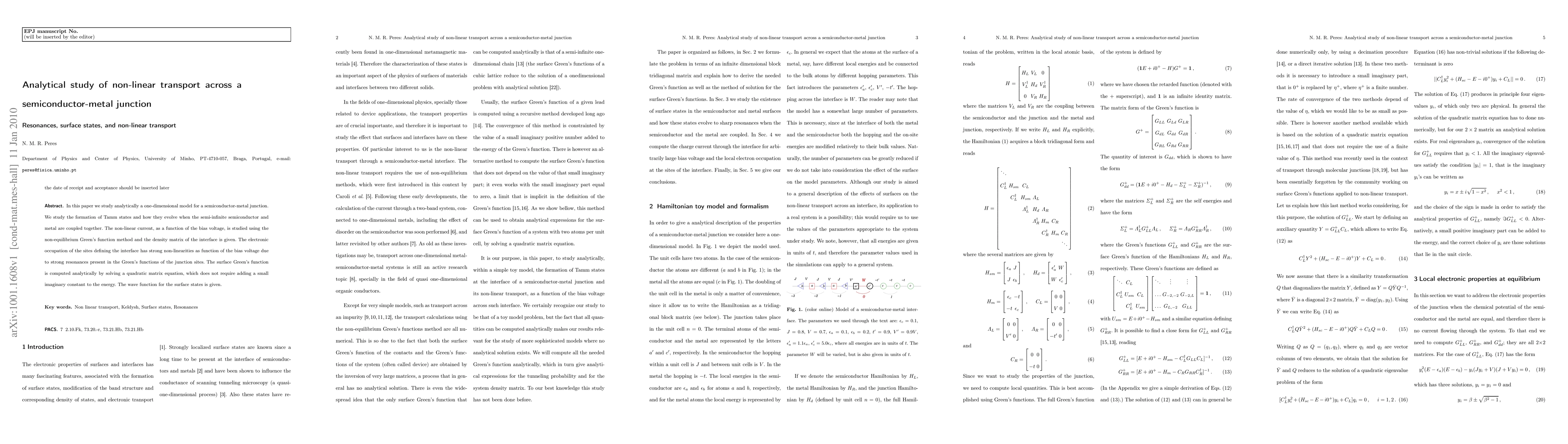 In this paper we study analytically a one-dimensional model for a semiconductor-metal junction. We study the formation of Tamm states and how they evolve when the semi-infinite semiconductor and metal are coupled together. The non-linear current, as a function of the bias voltage, is studied using the non-equilibrium Green's function method and the density matrix of the interface is given. The electronic occupation of the sites defining the interface has strong non-linearities as function of the bias voltage due to strong resonances present in the Green's functions of the junction sites. The surface Green's function is computed analytically by solving a quadratic matrix equation, which does not require adding a small imaginary constant to the energy. The wave function for the surface states is given.