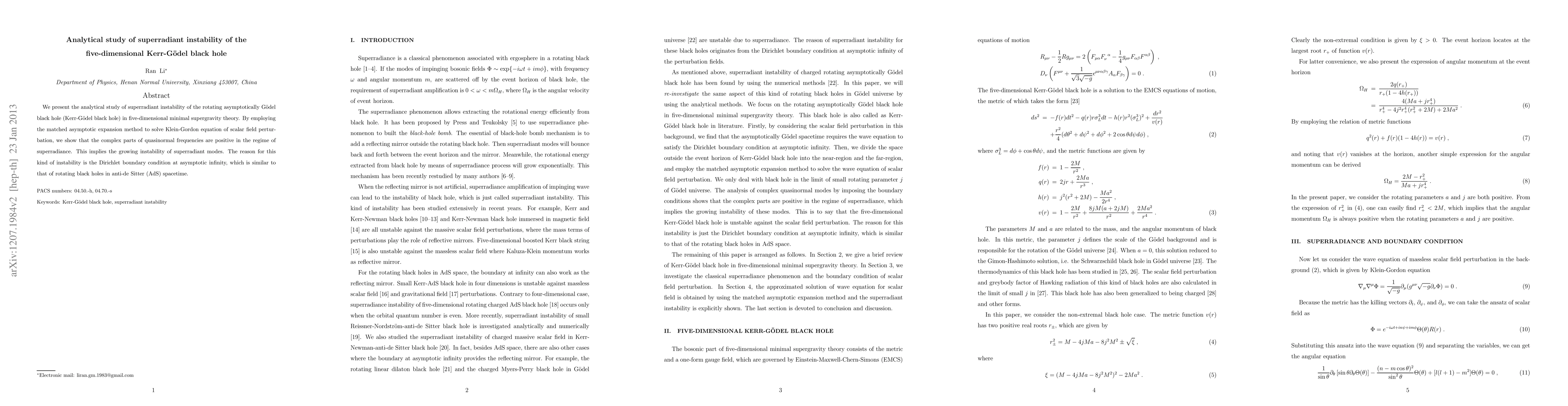 This paper analytically investigates superradiant instability in five-dimensional Kerr-Gödel black holes using matched asymptotic expansion. It demonstrates that the complex parts of quasinormal frequencies are positive, indicating growing instability in superradiant modes, akin to rotating black holes in AdS spacetime.