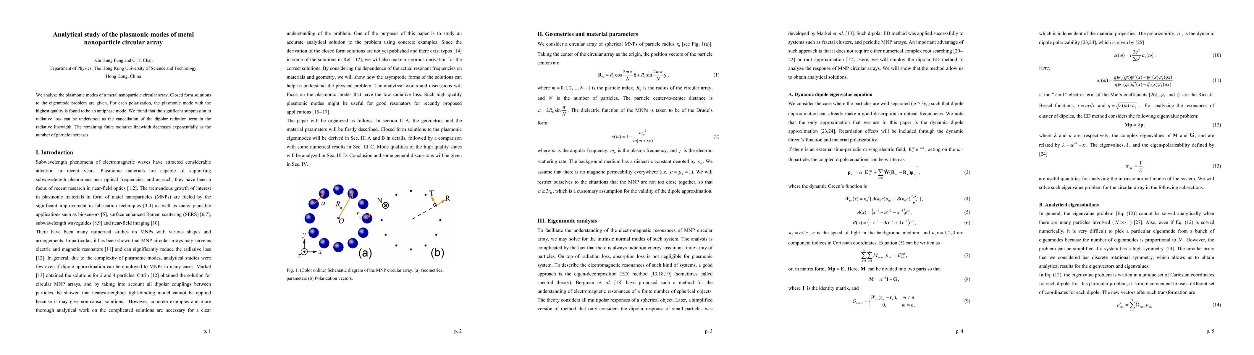 This paper provides closed-form solutions for the eigenmodes of a metal nanoparticle circular array, identifying an antiphase mode with the highest quality factor. The study reveals significant suppression of radiative loss due to the cancellation of the dipolar radiation term, with the remaining radiative linewidth decreasing exponentially with more particles.