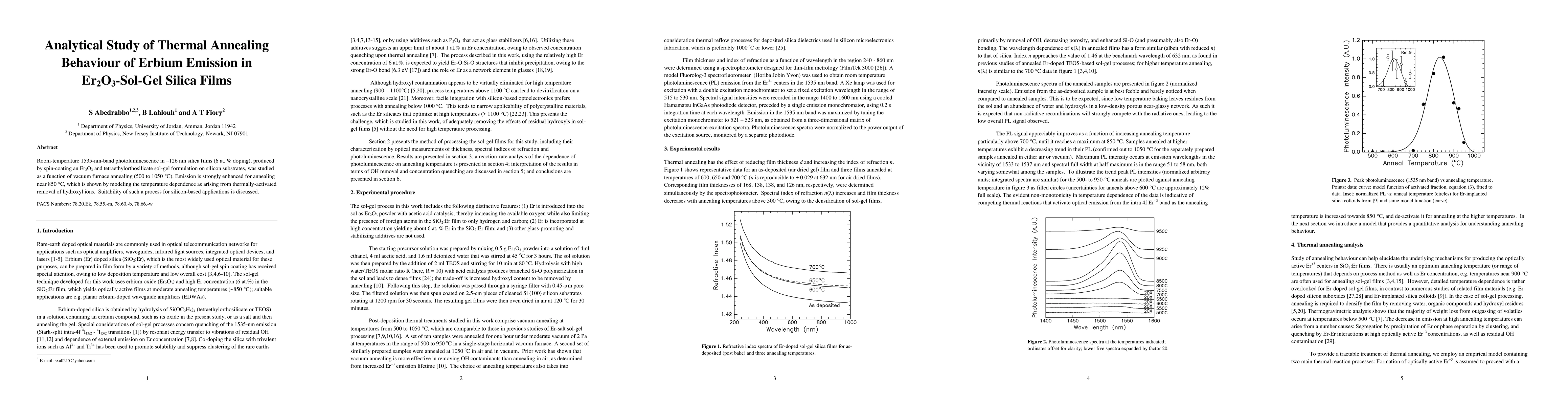 This study investigates the thermal annealing behavior of erbium emission in Er2O3-doped silica films, finding significant enhancement of 1535-nm photoluminescence at ~850°C due to hydroxyl ion removal, suggesting potential for silicon-based photonic applications.