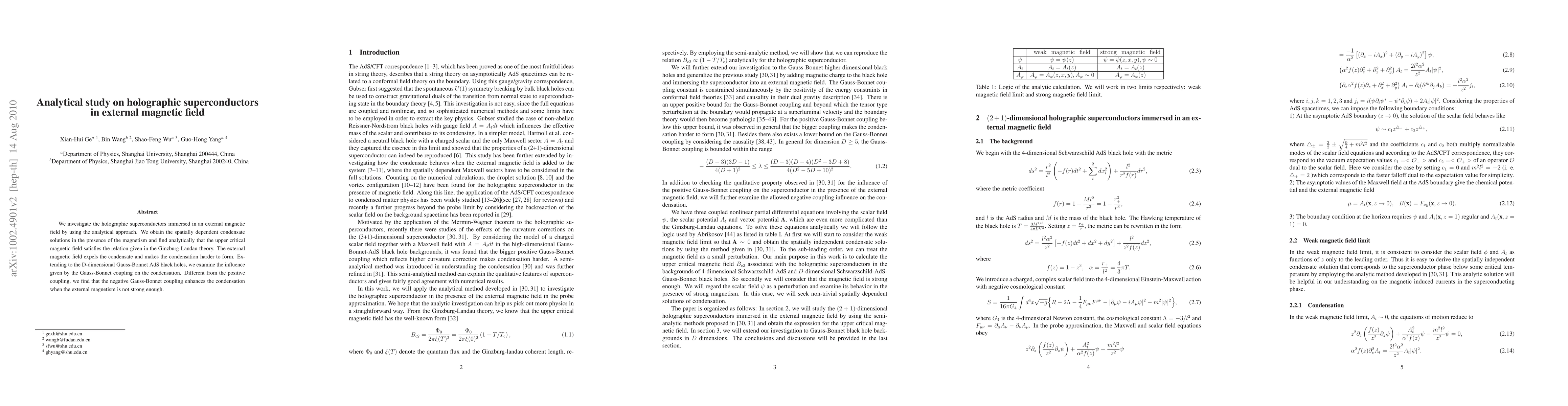 We investigate the holographic superconductors immersed in an external magnetic field by using the analytical approach. We obtain the spatially dependent condensate solutions in the presence of the magnetism and find analytically that the upper critical magnetic field satisfies the relation given in the Ginzburg-Landau theory. We observe analytically the reminiscent of the Meissner effect where the magnetic field expels the condensate. Extending to the D-dimensional Gauss-Bonnet AdS black holes, we examine the influence given by the Gauss-Bonnet coupling on the condensation. Different from the positive coupling, we find that the negative Gauss-Bonnet coupling enhances the condensation when the external magnetism is not strong enough.