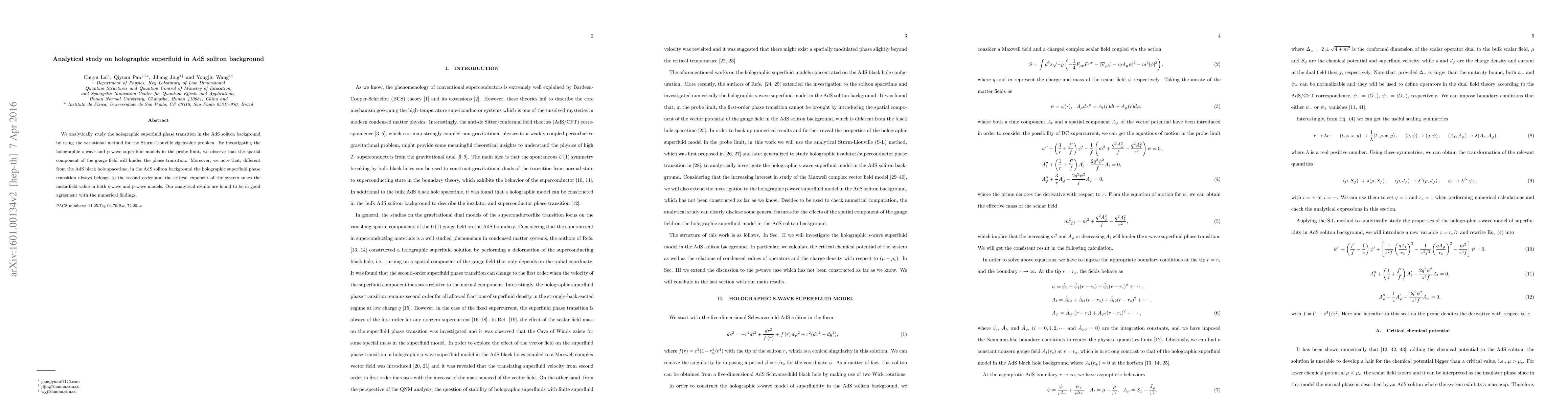 This paper analytically examines holographic superfluid phase transitions in an AdS soliton background using the variational method. It finds that the spatial gauge field component inhibits the transition, contrasting with AdS black hole spacetime, where the transition is consistently second-order with mean-field critical exponents in both s-wave and p-wave models, matching numerical results.