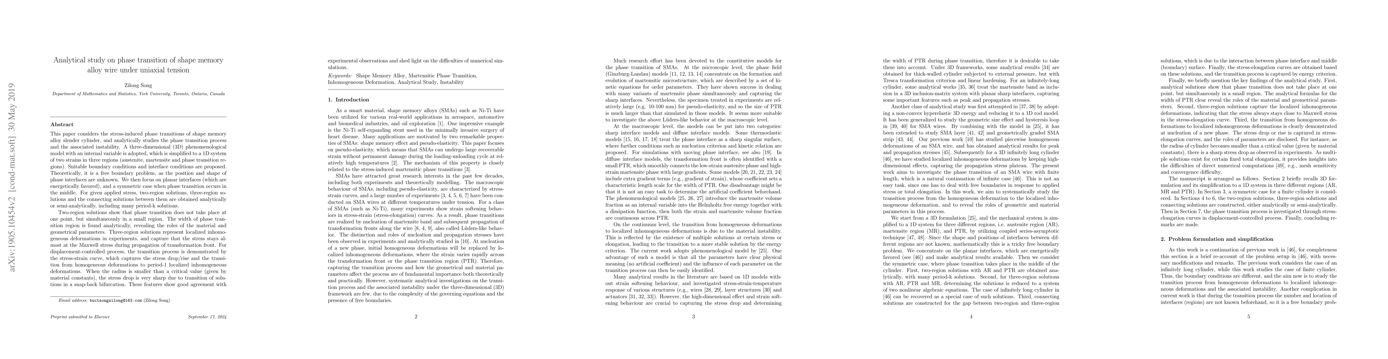 This paper analytically investigates the phase transition in shape memory alloy wire under uniaxial tension, employing a 3D phenomenological model simplified to a 1D system. It reveals the simultaneous phase transition in small regions and the stress behavior during transformation, showing good agreement with experimental observations and highlighting numerical simulation challenges.