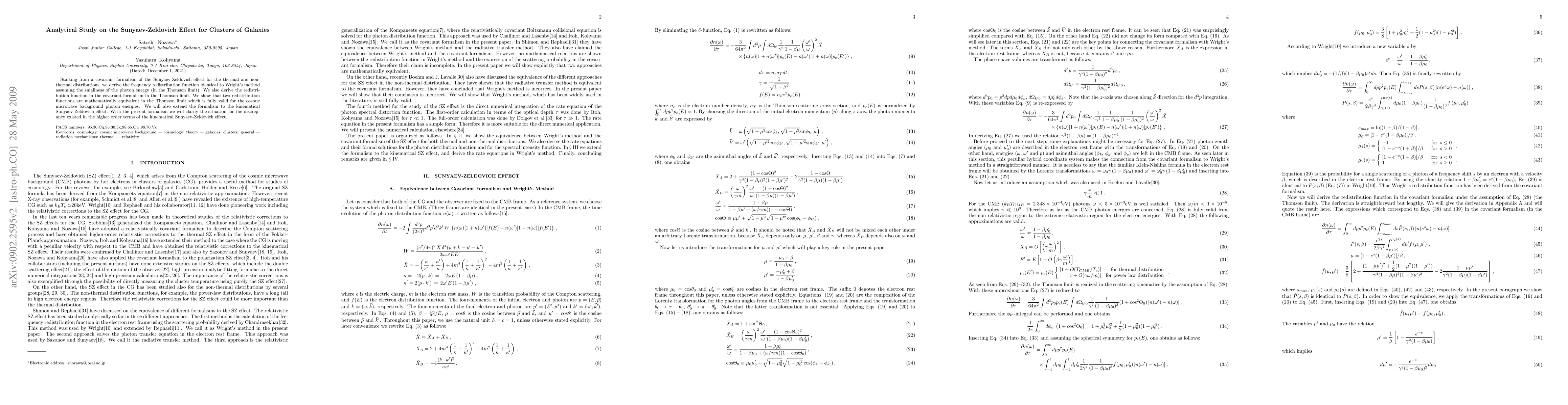 Starting from a covariant formalism of the Sunyaev-Zeldovich effect for the thermal and non-thermal distributions, we derive the frequency redistribution function identical to Wright's method assuming the smallness of the photon energy (in the Thomson limit). We also derive the redistribution function in the covariant formalism in the Thomson limit. We show that two redistribution functions are mathematically equivalent in the Thomson limit which is fully valid for the cosmic microwave background photon energies. We will also extend the formalism to the kinematical Sunyaev-Zeldovich effect. With the present formalism we will clarify the situation for the discrepancy existed in the higher order terms of the kinematical Sunyaev-Zeldovich effect.