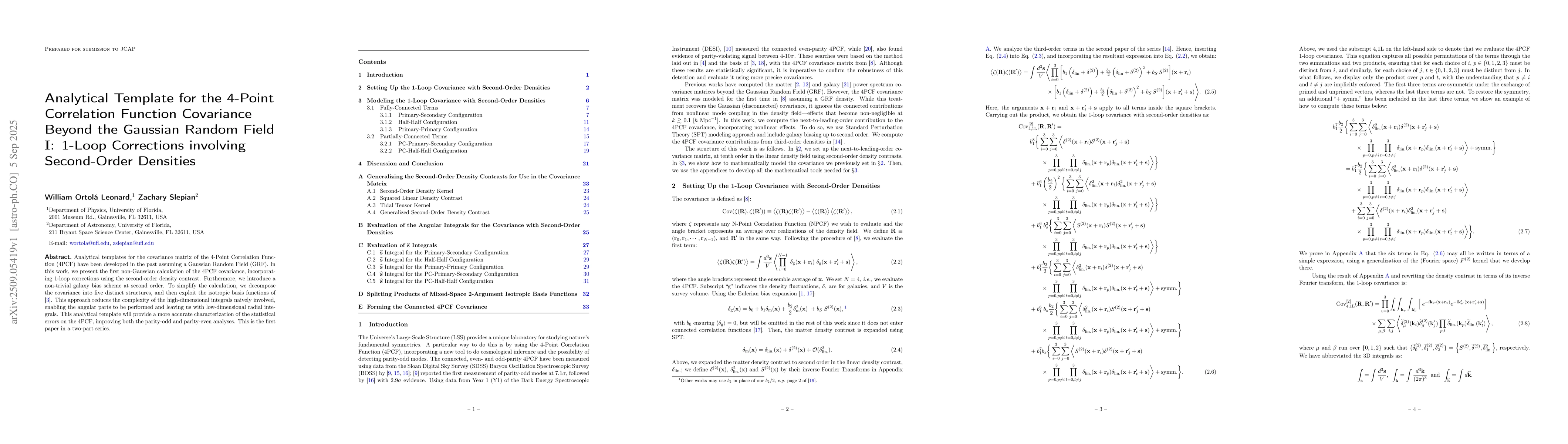 Analytical templates for the covariance matrix of the 4-Point Correlation Function (4PCF) have been developed in the past assuming a Gaussian Random Field (GRF). In this work, we present the first non-Gaussian calculation of the 4PCF covariance, incorporating 1-loop corrections using the second-order density contrast. Furthermore, we introduce a non-trivial galaxy bias scheme at second order. To simplify the calculation, we decompose the covariance into five distinct structures, and then exploit the isotropic basis functions of Cahn & Slepian (2023). This approach reduces the complexity of the high-dimensional integrals naively involved, enabling the angular parts to be performed and leaving us with low-dimensional radial integrals. This analytical template will provide a more accurate characterization of the statistical errors on the 4PCF, improving both the parity-odd and parity-even analyses. This is the first paper in a two-part series.