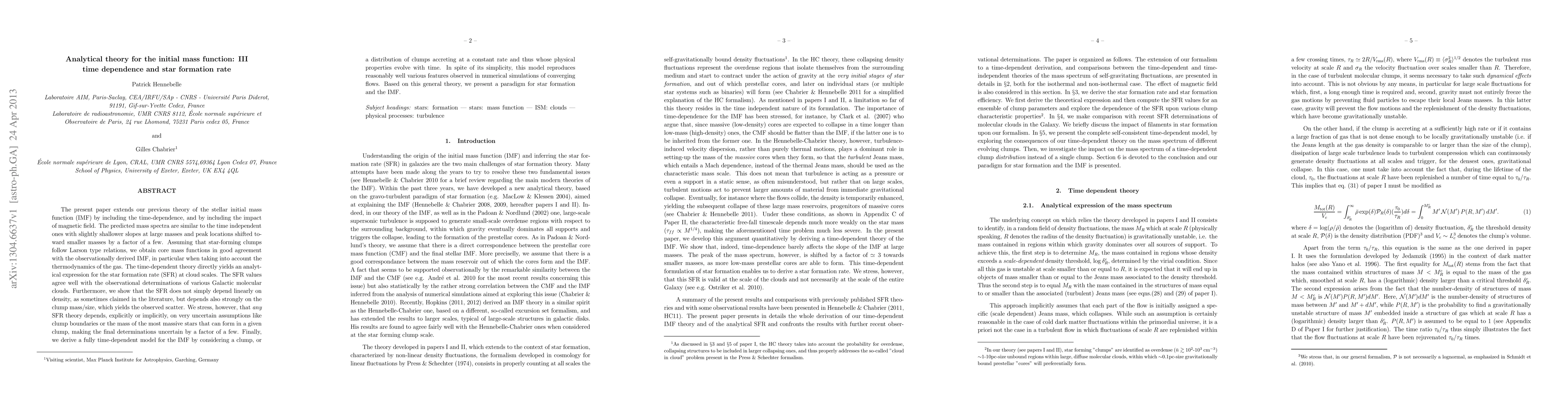 The present paper extends our previous theory of the stellar initial mass function (IMF) by including the time-dependence, and by including the impact of magnetic field. The predicted mass spectra are similar to the time independent ones with slightly shallower slopes at large masses and peak locations shifted toward smaller masses by a factor of a few. Assuming that star-forming clumps follow Larson type relations, we obtain core mass functions in good agreement with the observationally derived IMF, in particular when taking into account the thermodynamics of the gas. The time-dependent theory directly yields an analytical expression for the star formation rate (SFR) at cloud scales. The SFR values agree well with the observational determinations of various Galactic molecular clouds. Furthermore, we show that the SFR does not simply depend linearly on density, as sometimes claimed in the literature, but depends also strongly on the clump mass/size, which yields the observed scatter. We stress, however, that {\it any} SFR theory depends, explicitly or implicitly, on very uncertain assumptions like clump boundaries or the mass of the most massive stars that can form in a given clump, making the final determinations uncertain by a factor of a few. Finally, we derive a fully time-dependent model for the IMF by considering a clump, or a distribution of clumps accreting at a constant rate and thus whose physical properties evolve with time. In spite of its simplicity, this model reproduces reasonably well various features observed in numerical simulations of converging flows. Based on this general theory, we present a paradigm for star formation and the IMF.