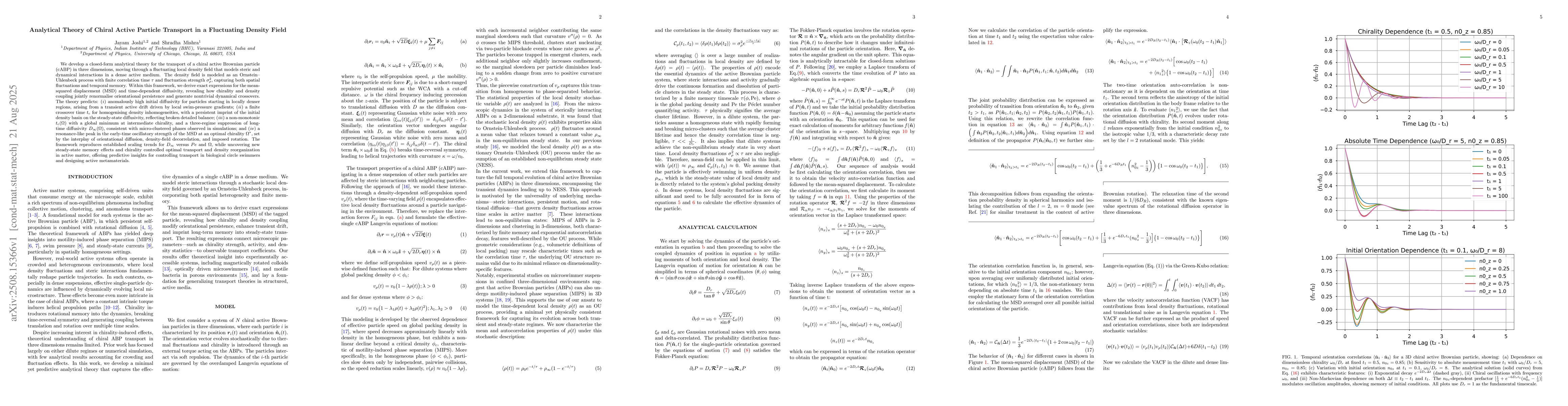 We develop a closed-form analytical theory for the transport of a chiral active Brownian particle (cABP) in three dimensions, moving through a fluctuating local density field that coarse-grains steric and dynamical interactions in a dense active medium. The density field is modeled as an Ornstein--Uhlenbeck process with finite correlation time $\tau$ and fluctuation strength $\sigma_\rho^2$, capturing both spatial variations and temporal memory. Within this framework, we derive exact expressions for the mean-squared displacement (MSD) and time-dependent diffusivity, showing how chirality and density coupling renormalize orientational persistence and generate dynamical crossovers. The theory predicts: (i) anomalously high initial diffusivity in denser regions, arising from a transient drift driven by local swim-pressure gradients; (ii) a finite crossover time $t_c$ for homogenizing density inhomogeneities, with steady-state diffusivity retaining memory of the initial environment; (iii) a non-monotonic $t_c(\Omega)$ with a global minimum at intermediate chirality, and a three-regime suppression of $D_\infty(\Omega)$ consistent with clustered phases in simulations; and (iv) a resonance-like peak in early-time oscillatory transport at an optimal chirality $\Omega^*$. The framework reproduces known scaling of $D_\infty$ with activity and chirality, while uncovering new memory effects and chirality-controlled optimal transport, offering predictive insight for biological circle swimmers and active metamaterials.