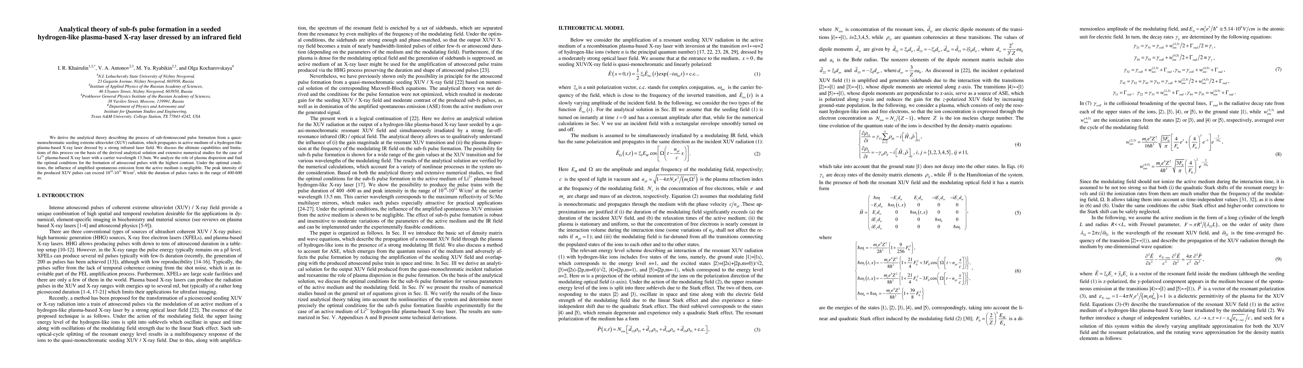 The paper presents an analytical theory for generating sub-femtosecond XUV pulses using a hydrogen-like plasma-based X-ray laser under an infrared field. It explores the conditions for producing attosecond pulses with high contrast, identifying optimal plasma dispersion and negligible amplified spontaneous emission. The theory predicts peak XUV pulse intensities of 10^10-10^11 W/cm² and durations of 400-600 attoseconds, with Li²⁺ plasma as a case study.