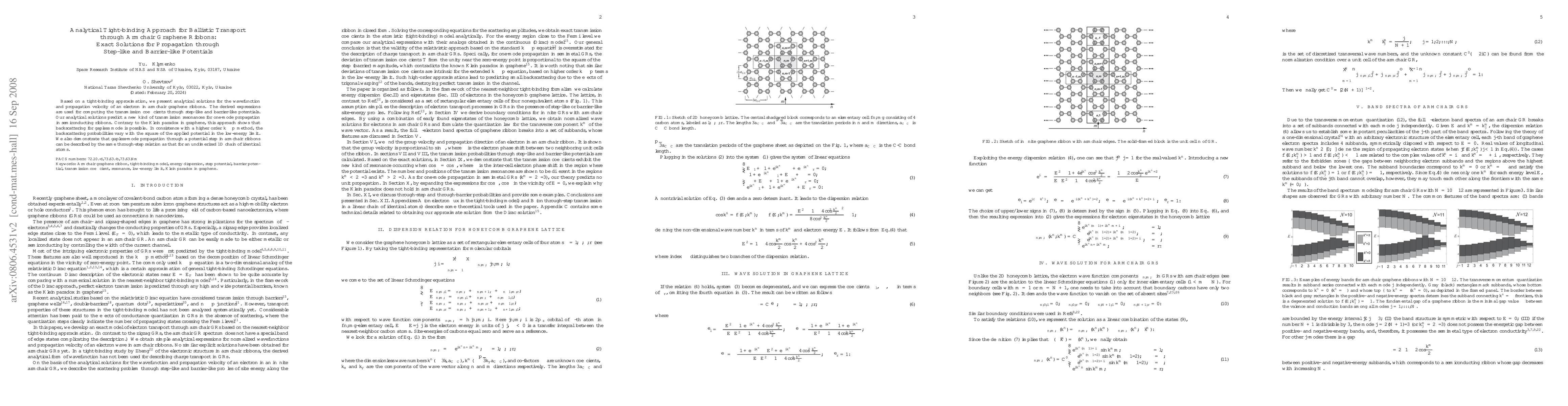 This paper presents analytical tight-binding solutions for electron transport in armchair graphene ribbons, revealing new transmission resonances and demonstrating that backscattering is possible for gapless modes, contrary to the Klein paradox. The study also shows that potential step propagation in these ribbons follows a similar relation to that in undimerized 1D atomic chains.