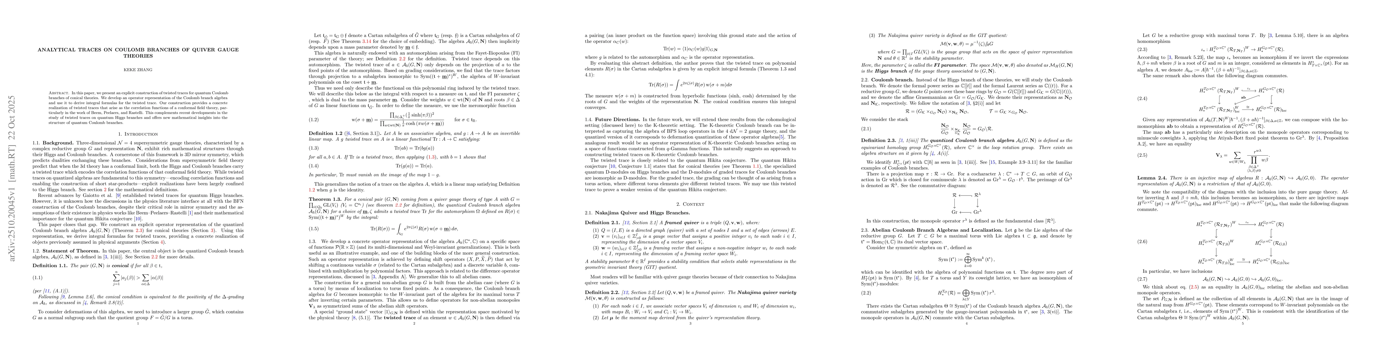 In this paper, we present an explicit construction of twisted traces for quantum Coulomb branches of conical theories. We develop an operator representation of the Coulomb branch algebra and use it to derive integral formulas for the twisted trace. Our construction provides a concrete realization of twisted traces that arise as the correlation functions of a conformal field theory, particularly in the work of Beem, Peelaers, and Rastelli. This complements recent developments in the study of twisted traces on quantum Higgs branches and offers new mathematical insights into the structure of quantum Coulomb branches.
