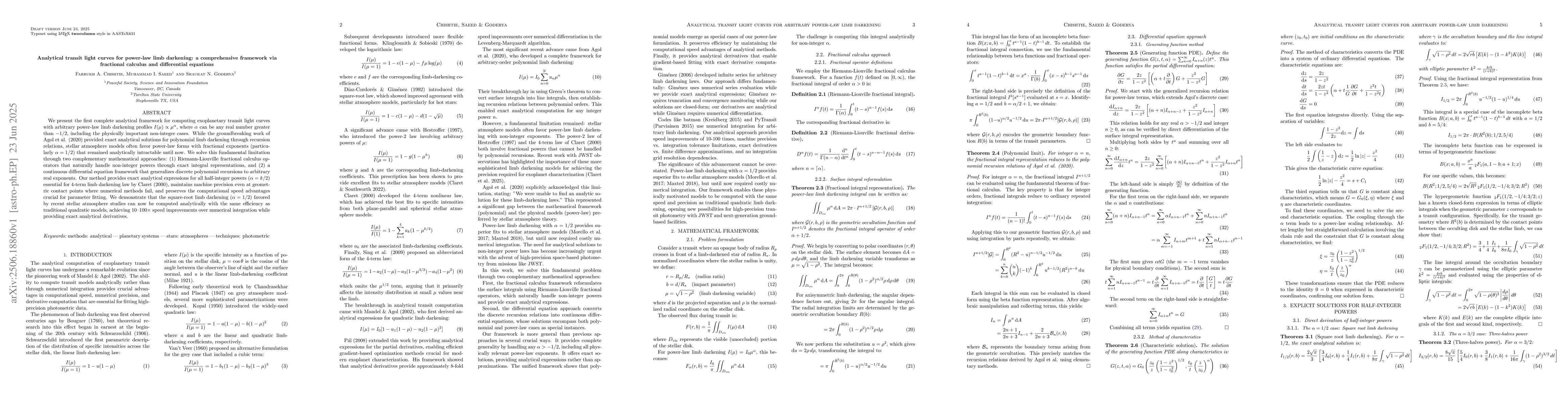 We present the first complete analytical framework for computing exoplanetary transit light curves with arbitrary power-law limb darkening profiles $I(\mu) \propto \mu^\alpha$, where $\alpha$ can be any real number greater than $-1/2$, including the physically important non-integer cases. While the groundbreaking work of Agol et al. (2020) provided exact analytical solutions for polynomial limb darkening through recursion relations, stellar atmosphere models often favor power-law forms with fractional exponents (particularly $\alpha = 1/2$) that remained analytically intractable until now. We solve this fundamental limitation through two complementary mathematical approaches: (1) Riemann-Liouville fractional calculus operators that naturally handle non-integer powers through exact integral representations, and (2) a continuous differential equation framework that generalizes discrete polynomial recursions to arbitrary real exponents. Our method provides exact analytical expressions for all half-integer powers ($\alpha = k/2$) essential for 4-term limb darkening law by Claret (2000), maintains machine precision even at geometric contact points where numerical methods fail, and preserves the computational speed advantages crucial for parameter fitting. We demonstrate that the square-root limb darkening ($\alpha = 1/2$) favored by recent stellar atmosphere studies can now be computed analytically with the same efficiency as traditional quadratic models, achieving 10--100$\times$ speed improvements over numerical integration while providing exact analytical derivatives.