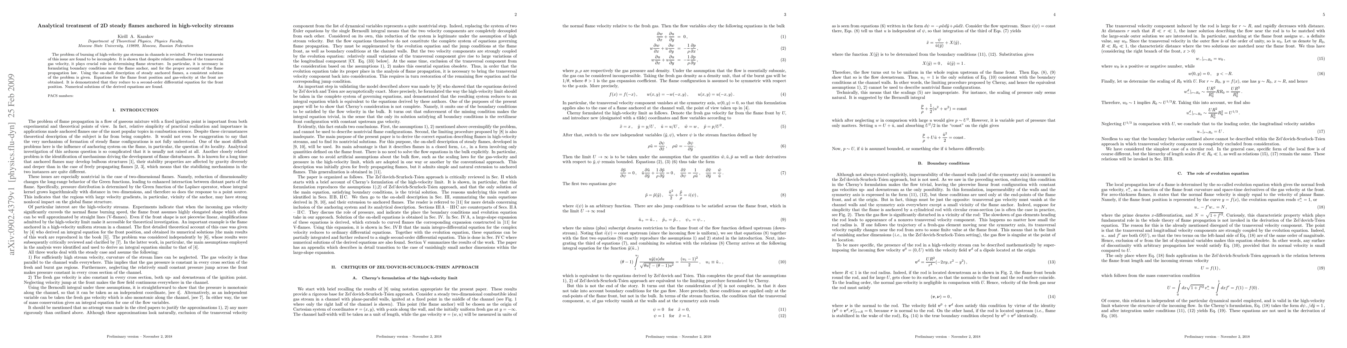 The problem of burning of high-velocity gas streams in channels is revisited. Previous treatments of this issue are found to be incomplete. It is shown that despite relative smallness of the transversal gas velocity, it plays crucial role in determining flame structure. In particular, it is necessary in formulating boundary conditions near the flame anchor, and for the proper account of the flame propagation law. Using the on-shell description of steady anchored flames, a consistent solution of the problem is given. Equations for the flame front position and gas-velocity at the front are obtained. It is demonstrated that they reduce to a second-order differential equation for the front position. Numerical solutions of the derived equations are found.