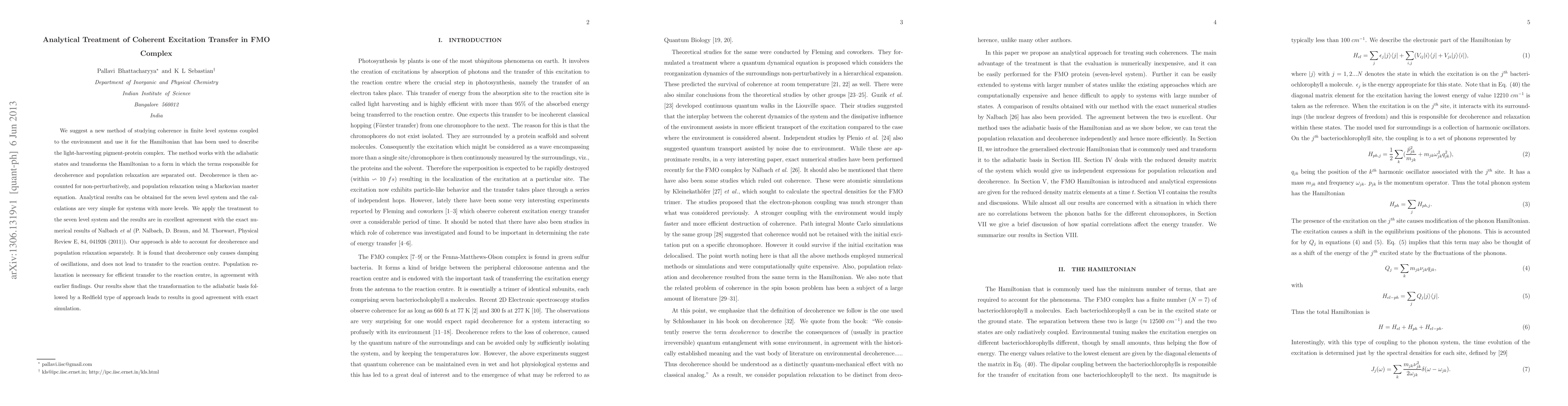 We suggest a new method of studying coherence in finite level systems coupled to the environment and use it for the Hamiltonian that has been used to describe the light-harvesting pigment-protein complex. The method works with the adiabatic states and transforms the Hamiltonian to a form in which the terms responsible for decoherence and population relaxation are separated out. Decoherence is then accounted for non-perturbatively, and population relaxation using a Markovian master equation. Analytical results can be obtained for the seven level system and the calculations are very simple for systems with more levels. We apply the treatment to the seven level system and the results are in excellent agreement with the exact numerical results of Nalbach et al. (P. Nalbach, D. Braun, and M. Thorwart, Physical Review E, 84, 041926 (2011)). Our approach is able to account for decoherence and population relaxation separately. It is found that decoherence only causes damping of oscillations, and does not lead to transfer to the reaction centre. Population relaxation is necessary for efficient transfer to the reaction centre, in agreement with earlier findings. Our results show that the transformation to the adiabatic basis followed by a Redfield type of approach leads to results in good agreement with exact simulation.