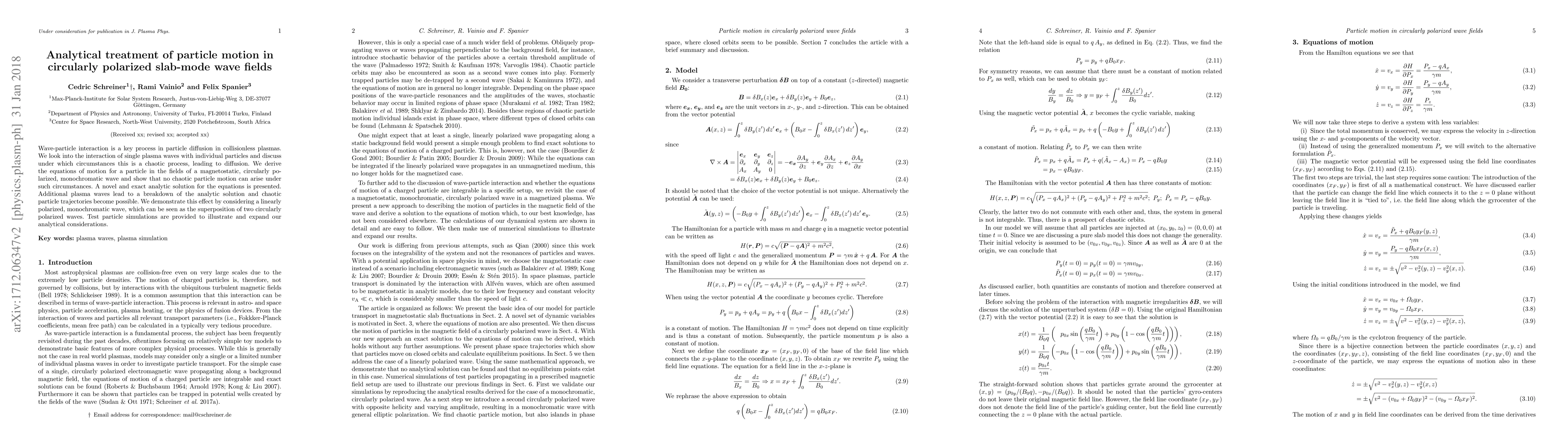 This paper analyzes the interaction between single circularly polarized slab-mode waves and particles, showing that no chaotic motion occurs under these conditions. However, the introduction of additional plasma waves, such as linearly polarized waves, can lead to chaotic particle trajectories, as demonstrated through both analytical solutions and test particle simulations.