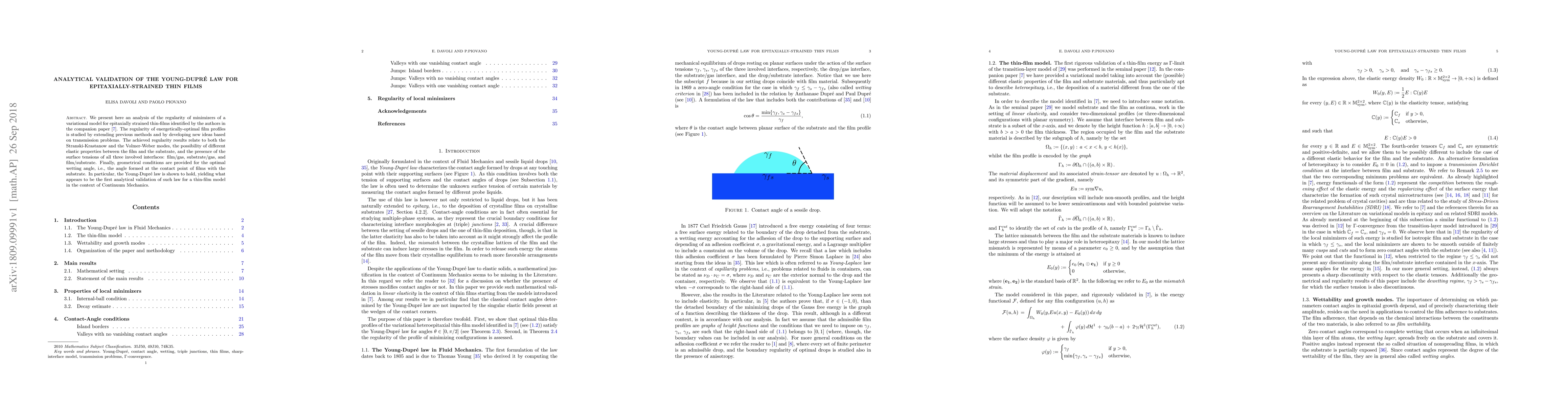 The research employs an analytical validation approach for the Yound-Dupr'e law concerning epitaxially-strained thin films, using variational models and extending previous methods for regularity analysis.
