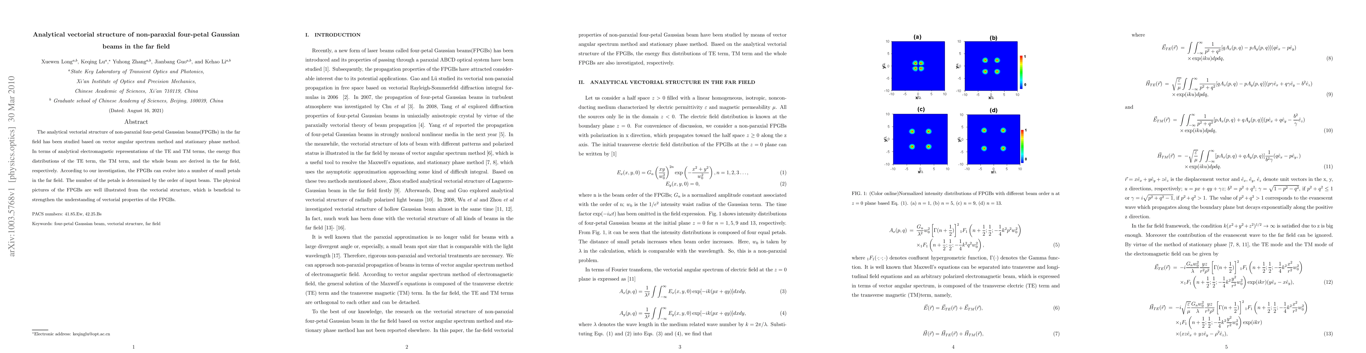 This paper investigates the analytical vectorial structure of non-paraxial four-petal Gaussian beams (FPGBs) in the far field using vector angular spectrum and stationary phase methods. It derives the energy flux distributions for TE and TM terms and demonstrates that FPGBs can split into multiple small petals in the far field, with the number of petals determined by the input beam's order.
