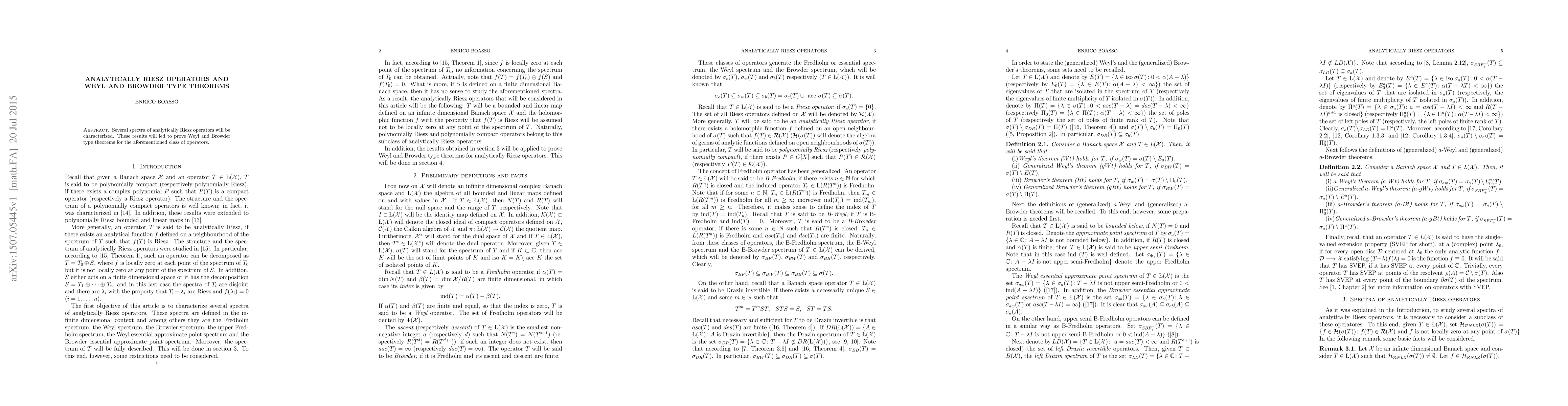 This paper characterizes spectra of analytically Riesz operators, leading to Weyl and Browder type theorems for this class of operators, with implications for operator theory.
