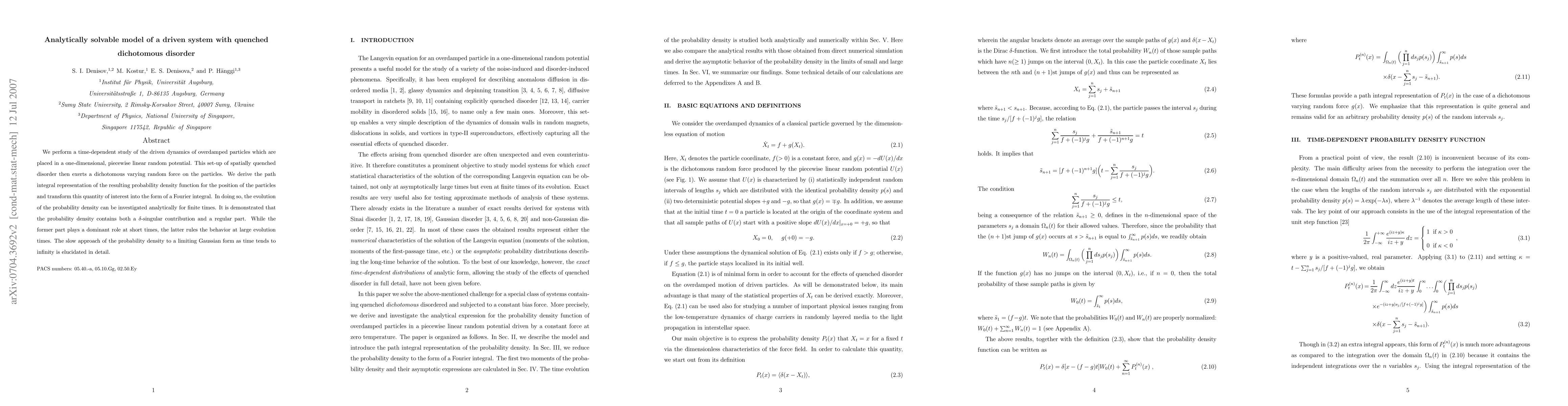 We perform a time-dependent study of the driven dynamics of overdamped particles which are placed in a one-dimensional, piecewise linear random potential. This set-up of spatially quenched disorder then exerts a dichotomous varying random force on the particles. We derive the path integral representation of the resulting probability density function for the position of the particles and transform this quantity of interest into the form of a Fourier integral. In doing so, the evolution of the probability density can be investigated analytically for finite times. It is demonstrated that the probability density contains both a $\delta$-singular contribution and a regular part. While the former part plays a dominant role at short times, the latter rules the behavior at large evolution times. The slow approach of the probability density to a limiting Gaussian form as time tends to infinity is elucidated in detail.