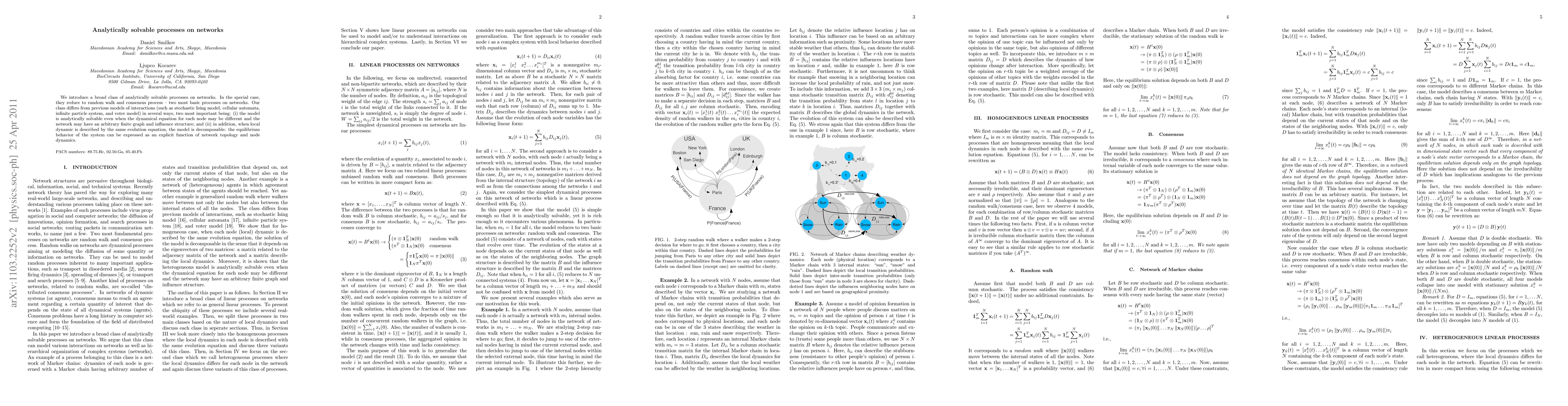 We introduce a broad class of analytically solvable processes on networks. In the special case, they reduce to random walk and consensus process - two most basic processes on networks. Our class differs from previous models of interactions (such as stochastic Ising model, cellular automata, infinite particle system, and voter model) in several ways, two most important being: (i) the model is analytically solvable even when the dynamical equation for each node may be different and the network may have an arbitrary finite graph and influence structure; and (ii) in addition, when local dynamic is described by the same evolution equation, the model is decomposable: the equilibrium behavior of the system can be expressed as an explicit function of network topology and node dynamics