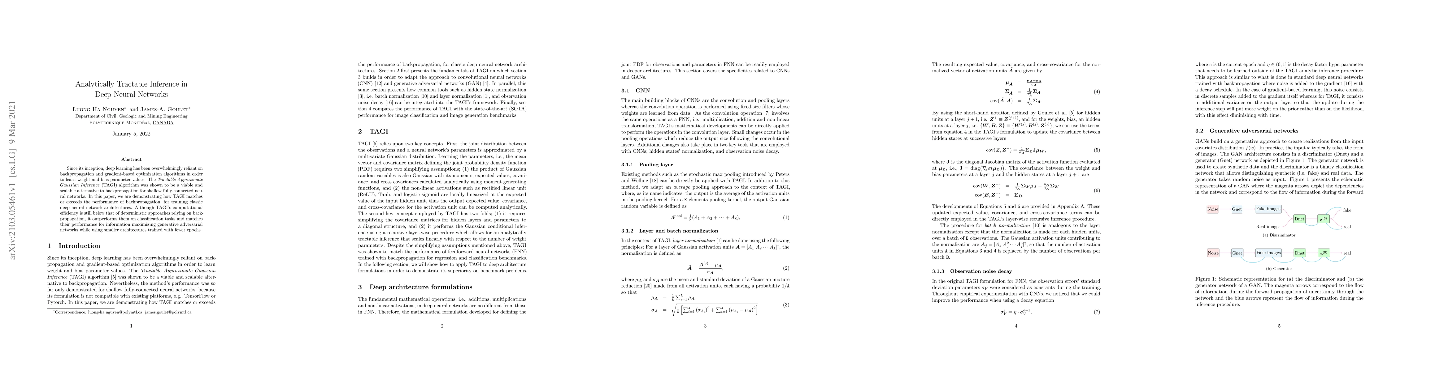 Since its inception, deep learning has been overwhelmingly reliant on backpropagation and gradient-based optimization algorithms in order to learn weight and bias parameter values. Tractable Approximate Gaussian Inference (TAGI) algorithm was shown to be a viable and scalable alternative to backpropagation for shallow fully-connected neural networks. In this paper, we are demonstrating how TAGI matches or exceeds the performance of backpropagation, for training classic deep neural network architectures. Although TAGI's computational efficiency is still below that of deterministic approaches relying on backpropagation, it outperforms them on classification tasks and matches their performance for information maximizing generative adversarial networks while using smaller architectures trained with fewer epochs.