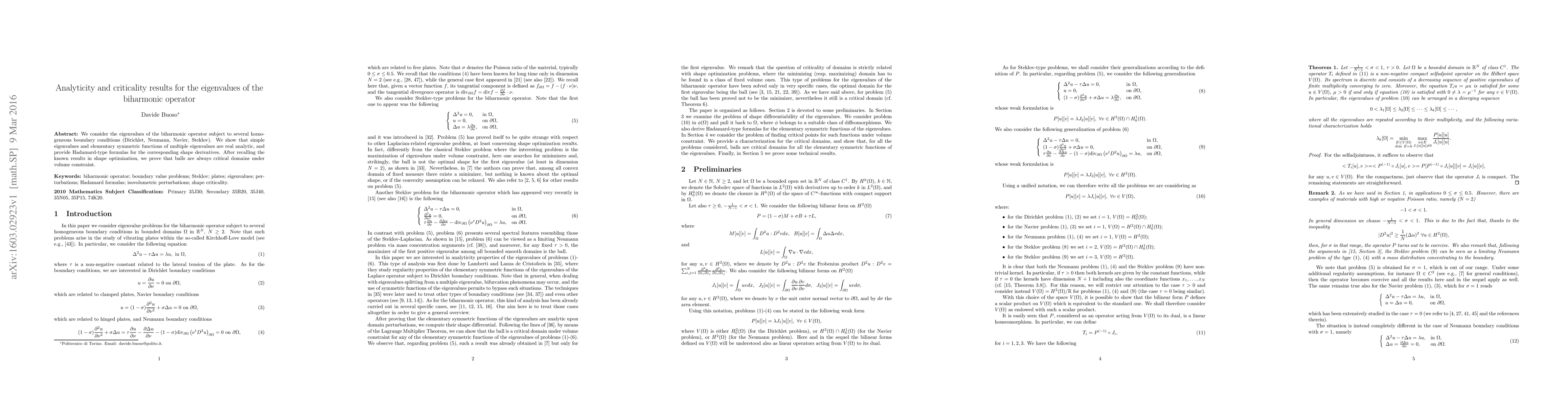 This paper investigates the eigenvalues of the biharmonic operator under various boundary conditions, demonstrating that simple and symmetric functions of multiple eigenvalues are real analytic. It also proves that balls are critical domains under volume constraints in shape optimization.