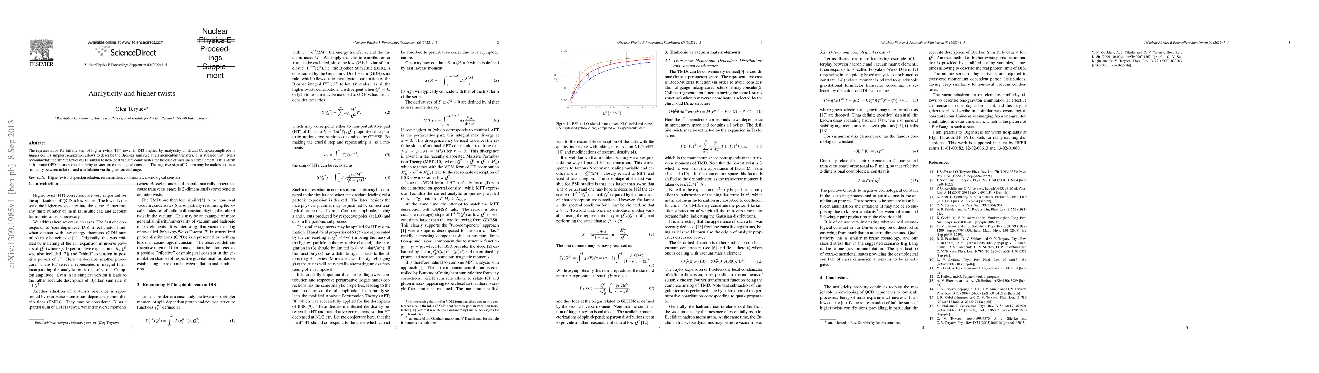 The representation for infinite sum of higher twists (HT) tower in DIS implied by analyticity of virtual Compton amplitude is suggested. Its simplest realization allows to describe the Bjorken sum rule at all momentum transfers. It is stressed that TMDs accommodate the infinite tower of HT similar to non-local vacuum condensates for the case of vacuum matrix element. The D-term in hadronic GPDs bears some similarity to vacuum cosmological constant. The negative sign of D-term may be understood as a similarity between inflation and annihilation via the graviton exchange.