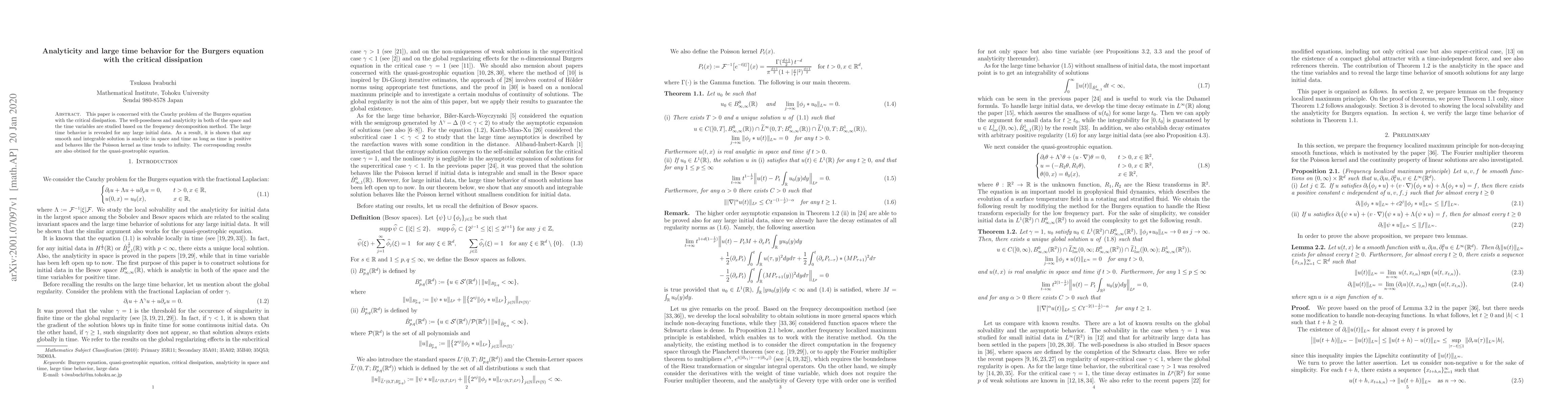 This paper investigates the Cauchy problem for the Burgers equation with critical dissipation, proving analyticity and establishing large time behavior using the frequency decomposition method. It shows that smooth, integrable solutions remain analytic in both space and time and behave like the Poisson kernel as time approaches infinity.