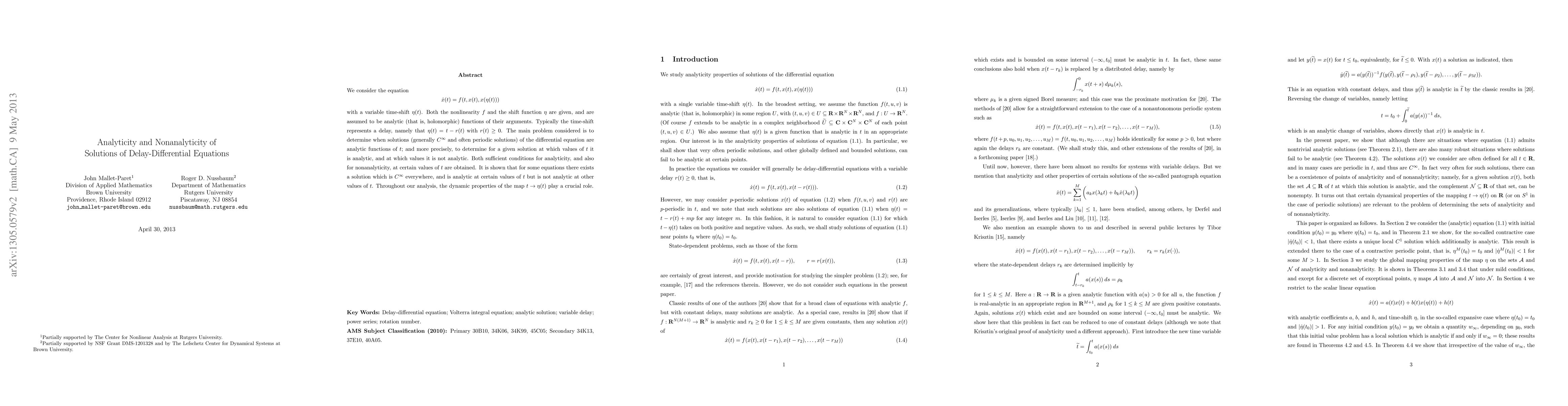 This paper investigates whether solutions to delay-differential equations with analytic functions are also analytic, focusing on conditions for both analyticity and nonanalyticity at specific values of time.