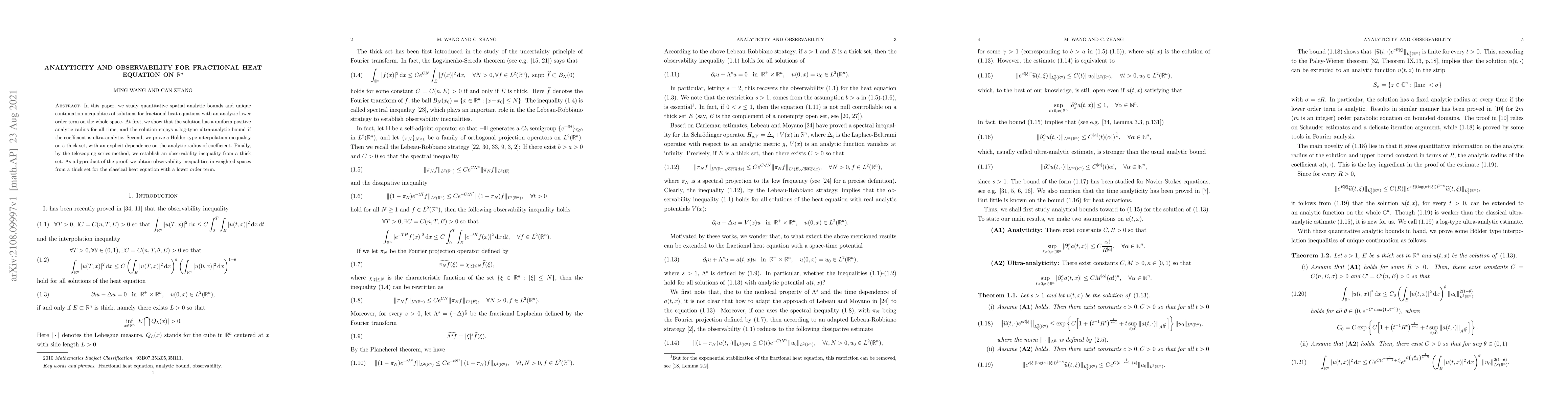 This paper investigates analytic bounds and observability for fractional heat equations in $\mathbb{R}^n$. It establishes a uniform analytic radius for solutions and proves unique continuation inequalities, along with a Hölder interpolation inequality. An observability inequality is derived using the telescoping series method, extending results to classical heat equations.