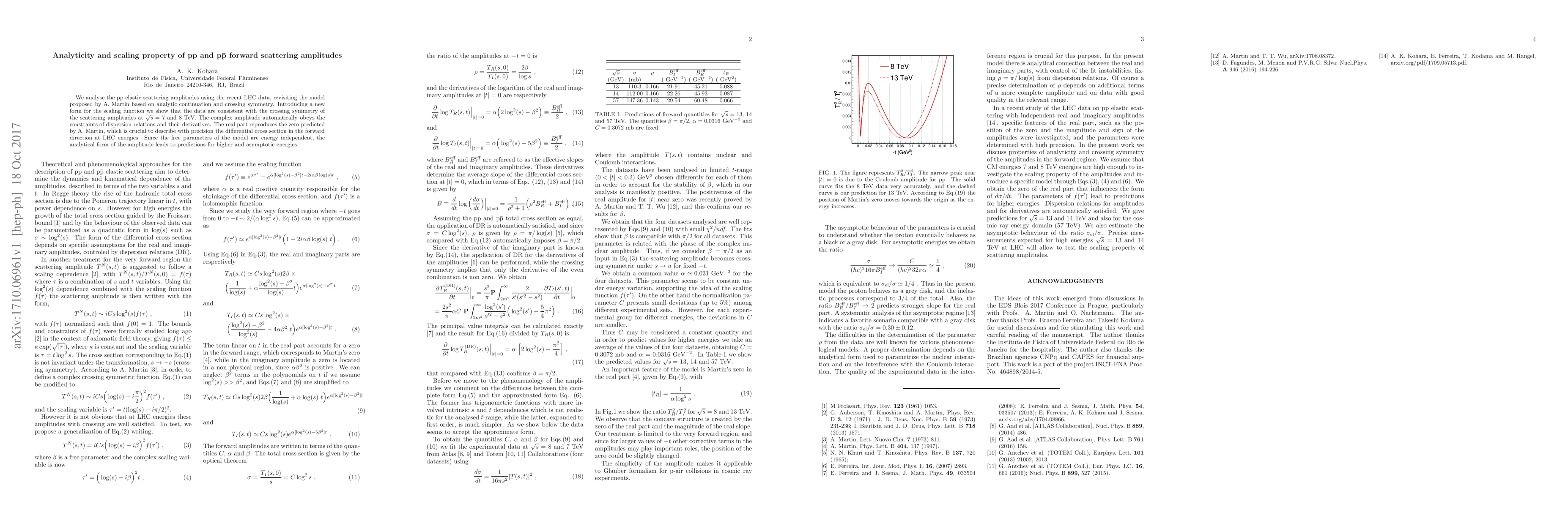 We analyse the pp elastic scattering amplitudes using the recent LHC data, revisiting the model proposed by A. Martin based on analytic continuation and crossing symmetry. Introducing a new form for the scaling function we show that the data are consistent with the crossing symmetry of the scattering amplitudes at $\sqrt{s}= $ 7 and 8 TeV. The complex amplitude automatically obeys the constraints of dispersion relations and their derivatives. The real part reproduces the zero predicted by A. Martin, which is crucial to describe with precision the differential cross section in the forward direction at LHC energies. Since the free parameters of the model are energy independent, the analytical form of the amplitude leads to predictions for higher and asymptotic energies.