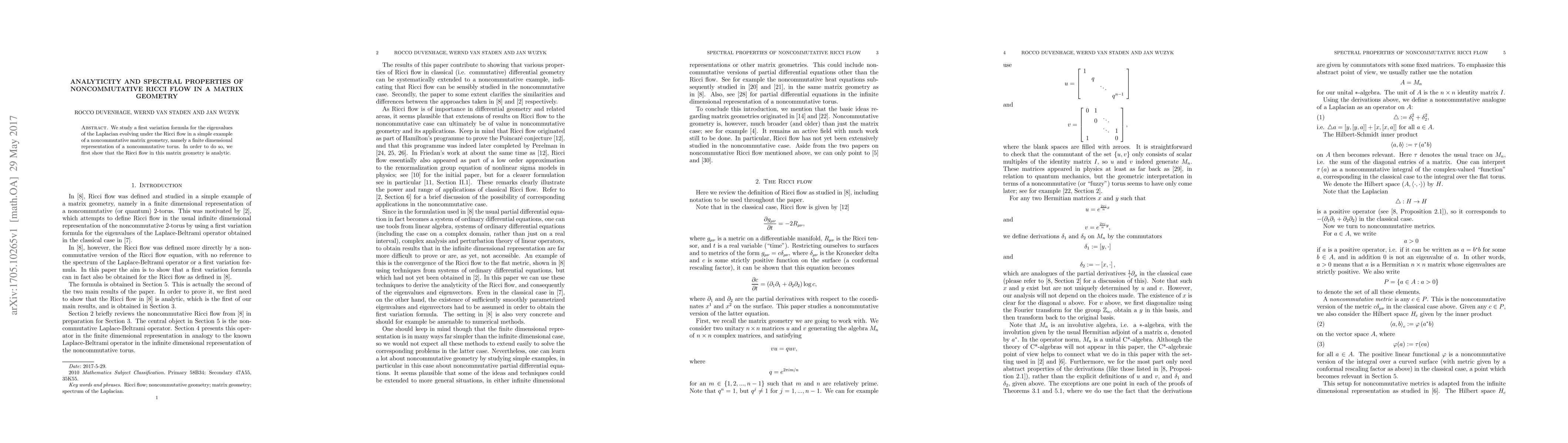 Summary: This paper investigates the first variation of eigenvalues in the Laplacian under Ricci flow in a noncommutative matrix geometry, specifically a finite-dimensional representation of a noncommutative torus, and demonstrates the analyticity of the Ricci flow in this setting.