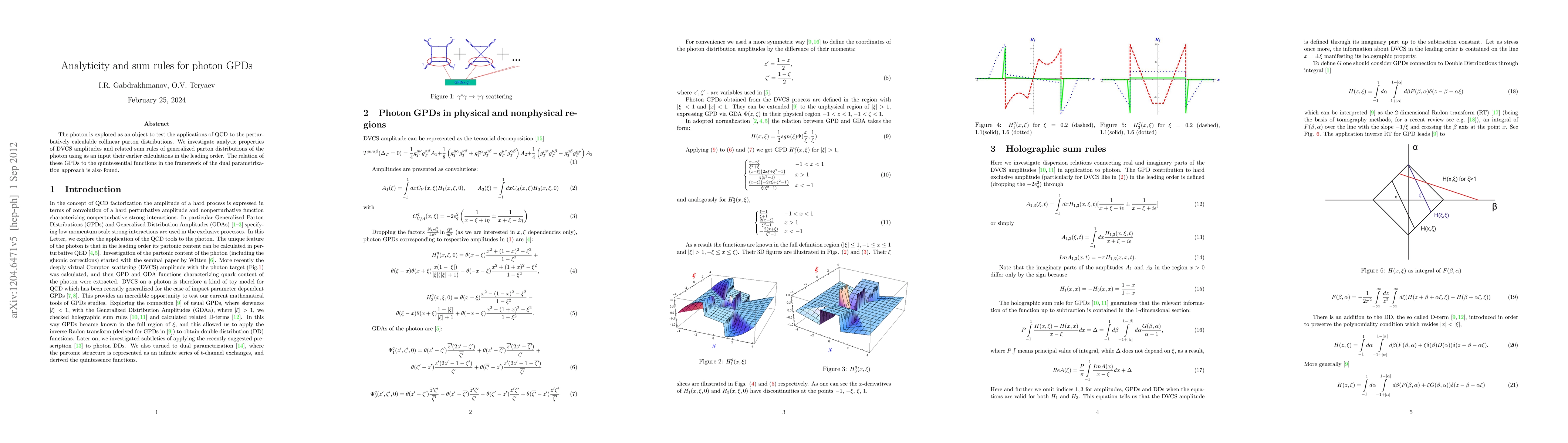 The photon is explored as an object to test the applications of QCD to the perturbatively calculable collinear parton distributions. We investigate analytic properties of DVCS amplitudes and related sum rules of generalized parton distributions of the photon using as an input their earlier calculations in the leading order. The relation of these GPDs to the quintessential functions in the framework of the dual parametrization approach is also found.