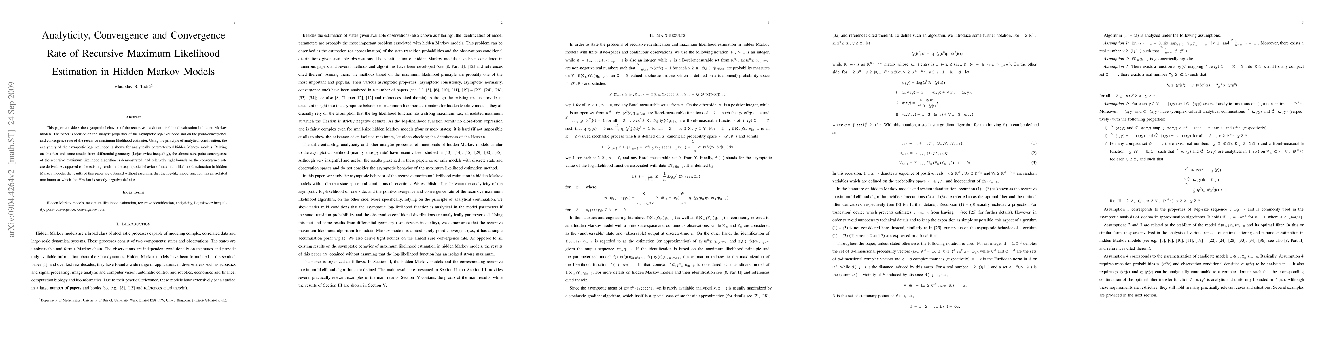 This paper examines the asymptotic properties of recursive maximum likelihood estimation in hidden Markov models, proving the analyticity of the log-likelihood function and demonstrating almost sure point-convergence and convergence rate bounds, without assuming an isolated maximum for the log-likelihood function.