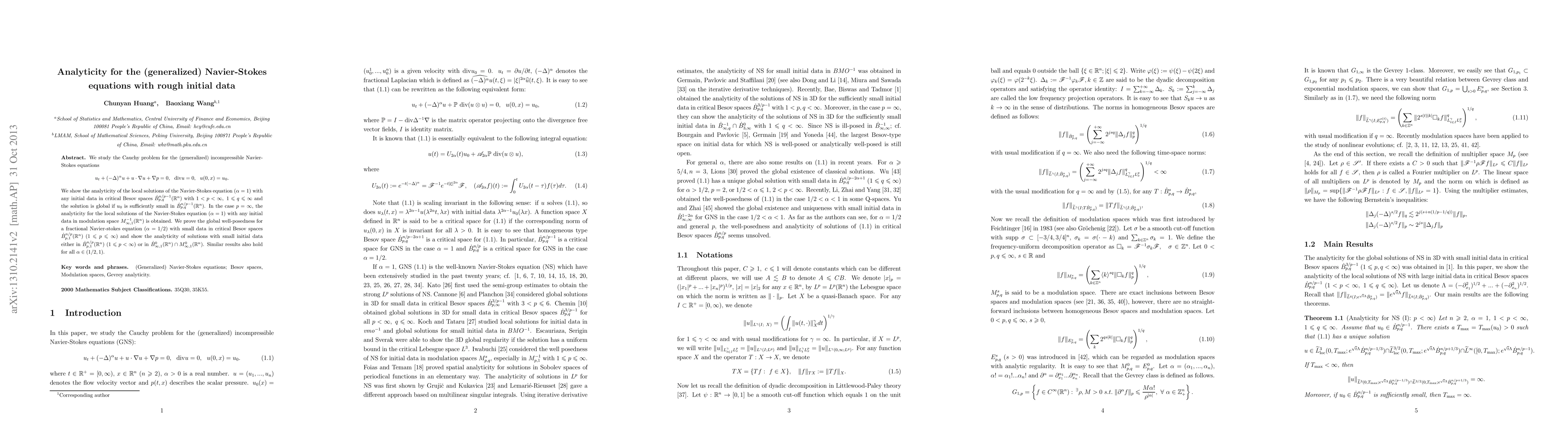 This paper investigates the analyticity and global well-posedness of solutions to the generalized incompressible Navier-Stokes equations with rough initial data in various function spaces. It demonstrates local analyticity for solutions to the Navier-Stokes equation with initial data in critical Besov spaces and global well-posedness for fractional Navier-Stokes equations with small data in specified Besov and modulation spaces.