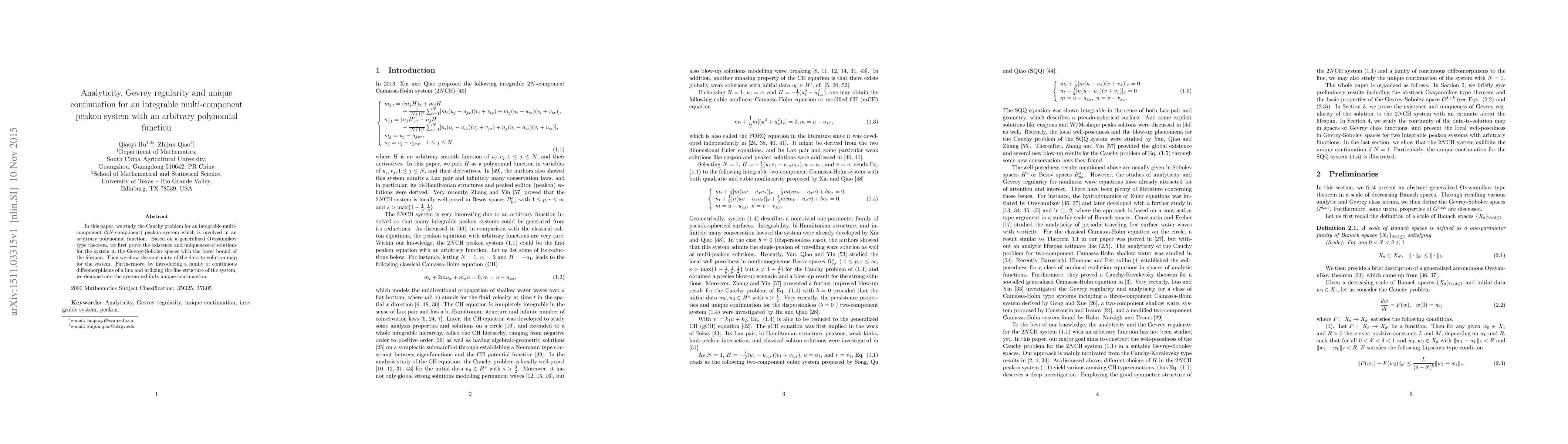 This paper investigates the Cauchy problem for an integrable multi-component peakon system with polynomial functions, proving existence, uniqueness, and continuity of solutions in Gevrey-Sobolev spaces. It also demonstrates the system's unique continuation property through continuous diffeomorphisms.