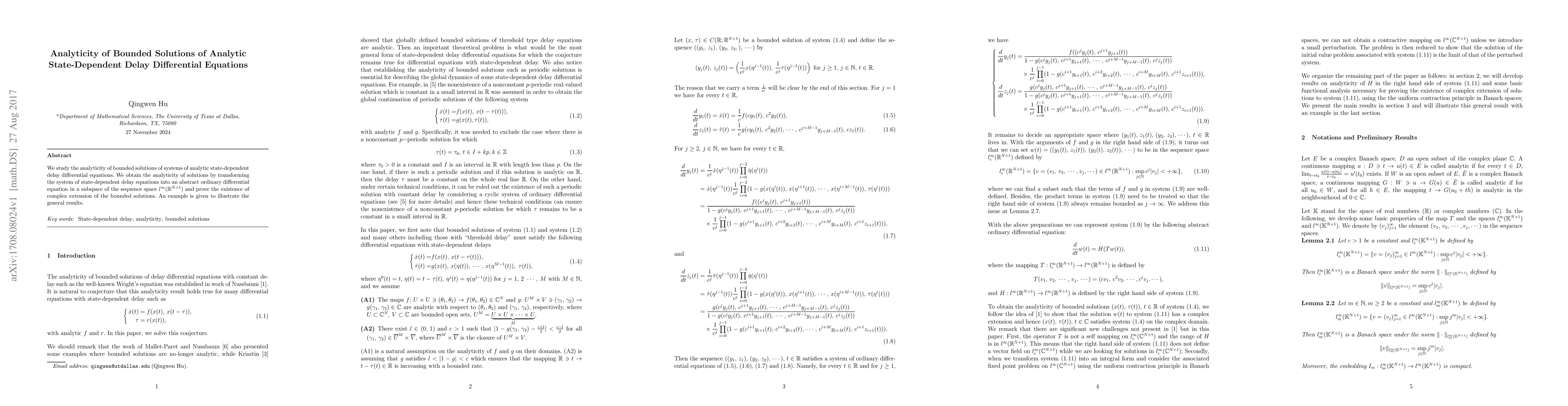 This paper investigates the analyticity of bounded solutions for analytic state-dependent delay differential equations by transforming the system into an abstract ordinary differential equation. It proves the existence of complex extensions of these bounded solutions and provides an example to illustrate the findings.