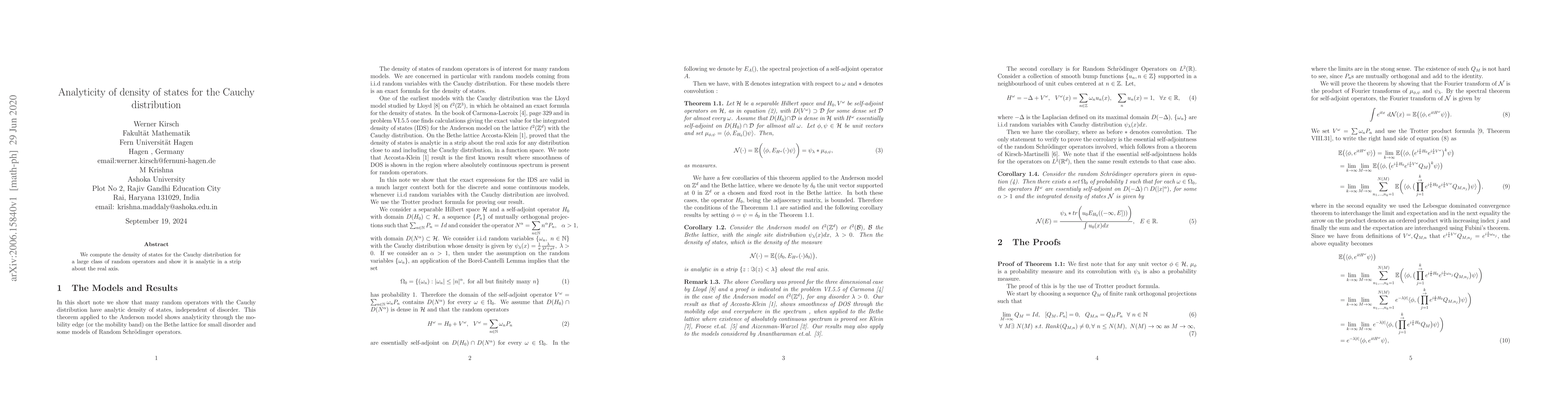 Summary: The paper computes the density of states for random operators associated with the Cauchy distribution and demonstrates its analyticity within a strip centered around the real axis. This result provides insight into the spectral properties of such operators.